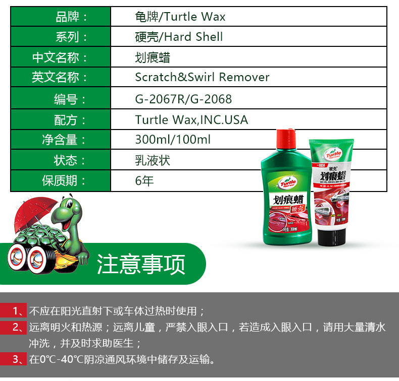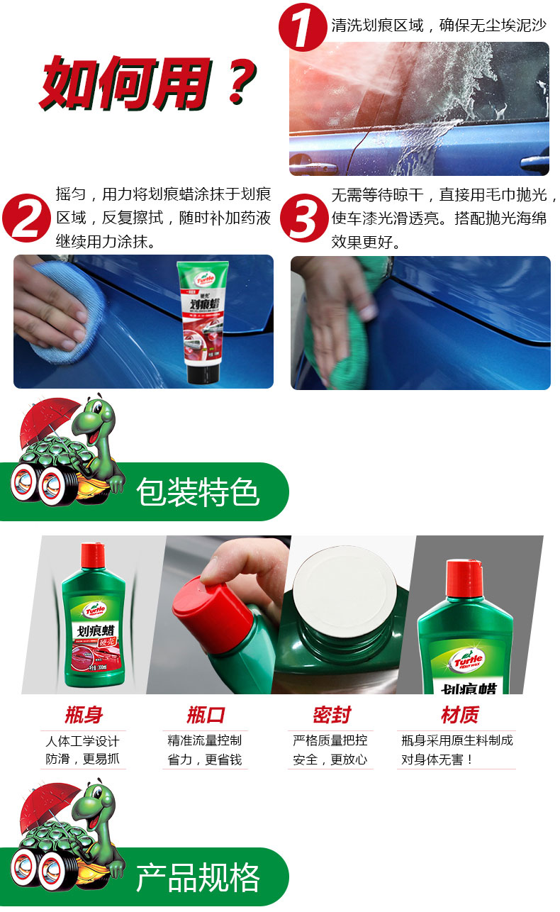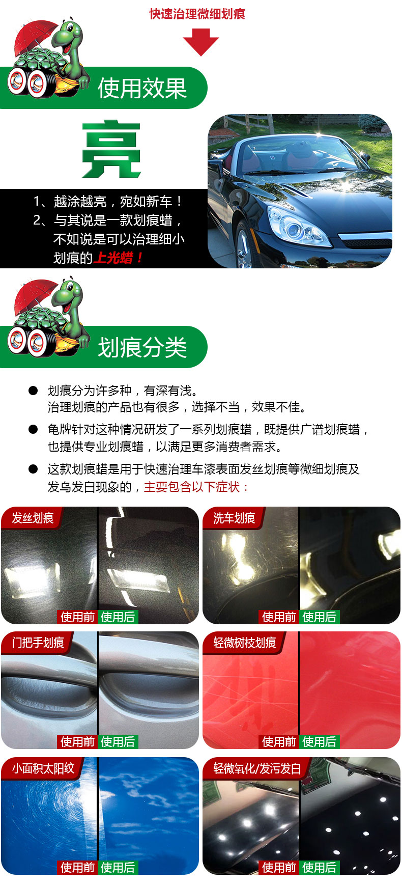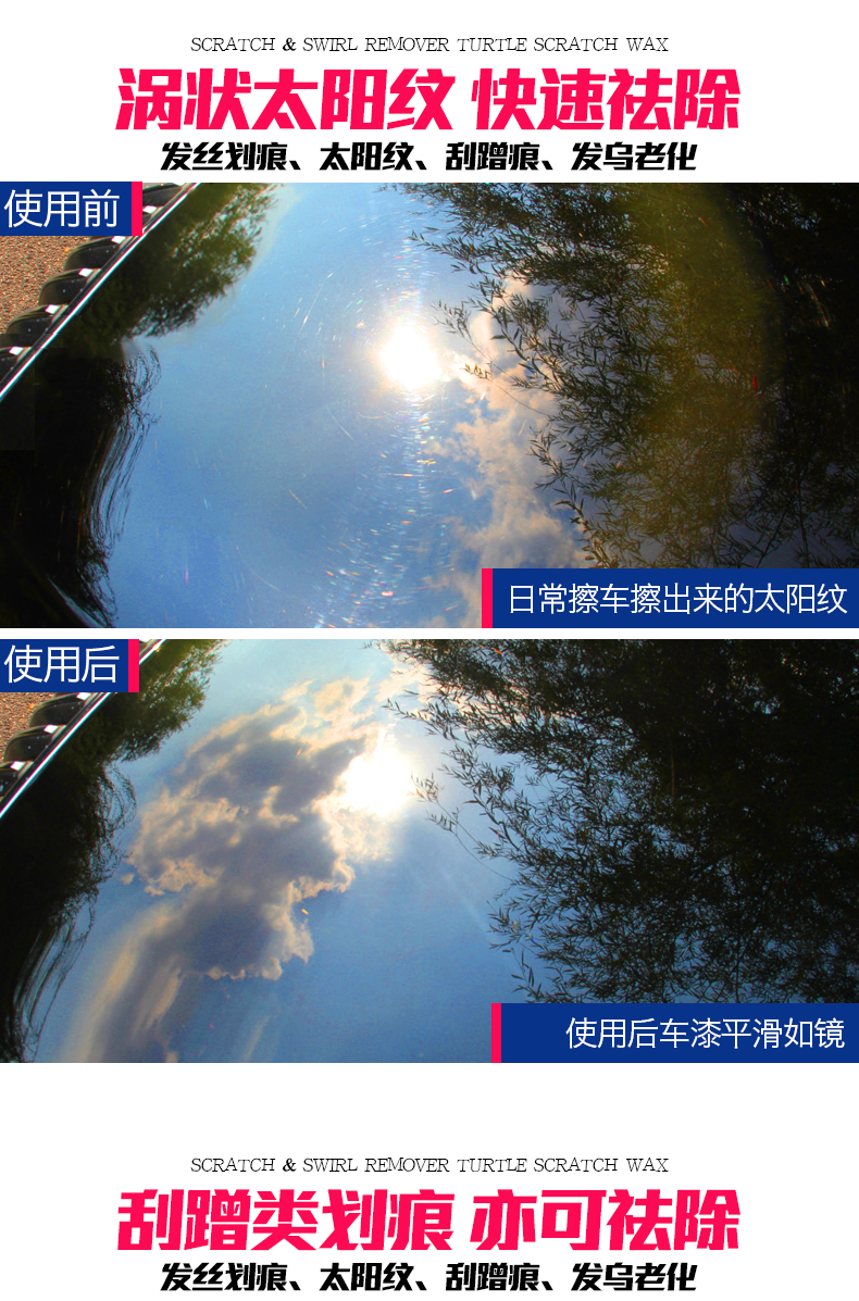 用途:用于修复车漆的表层下次和细微划痕;发丝纹、太阳纹、毛巾擦痕、车漆黯淡发乌、车漆氧化层厚重等。 特点:透明漆配方,使用安全,润滑性强,集修复、还原、上光为一体。 使用:先清洁车漆,将车蜡挤在打蜡海绵或者毛巾上,在划痕处均有涂抹,并反复擦拭,然后使用干毛巾擦净即可。可局部使用,亦可全车使用,将全车进行翻新。 规格:100ml装。