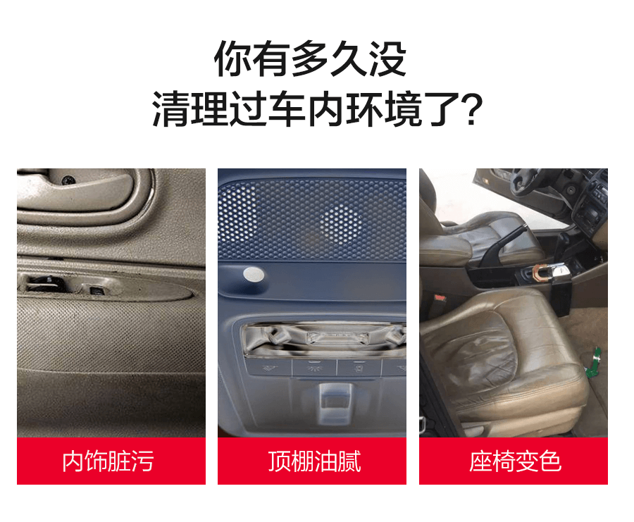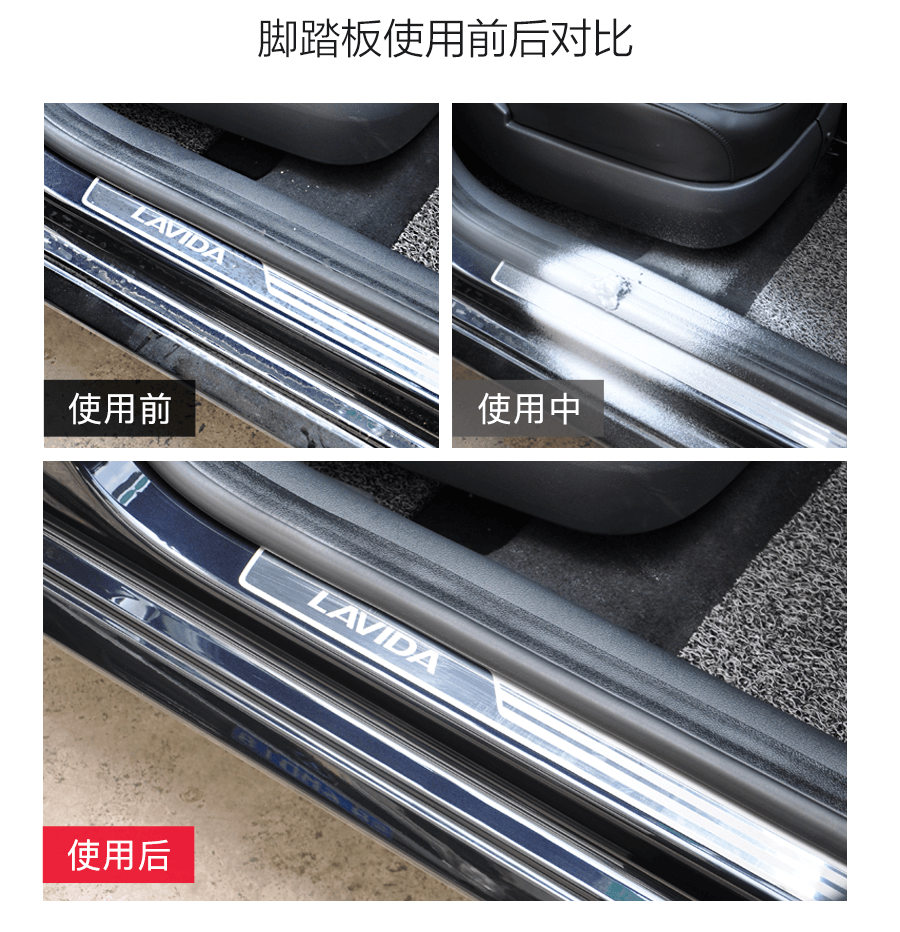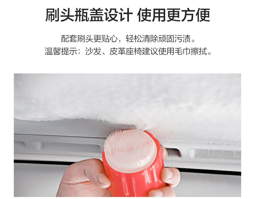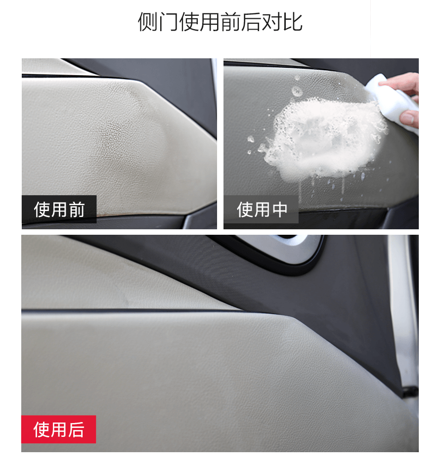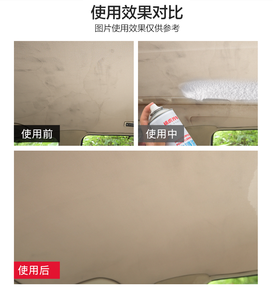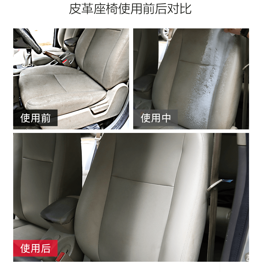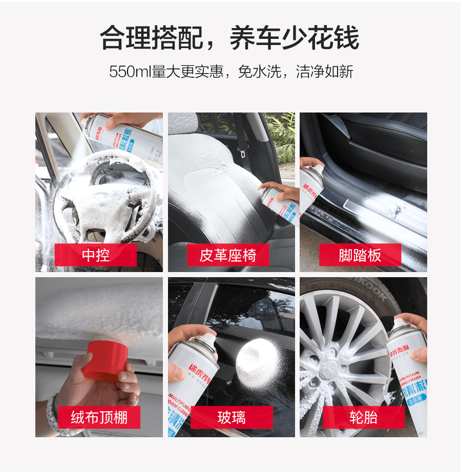 泡沫溶解污渍,随空气挥发,一喷一抹,使用方便。如果碰到如脚垫、座椅等比较顽固的污渍,可以使用刷子清除。适合汽车内饰、皮革等表面清洗。每瓶550ml。