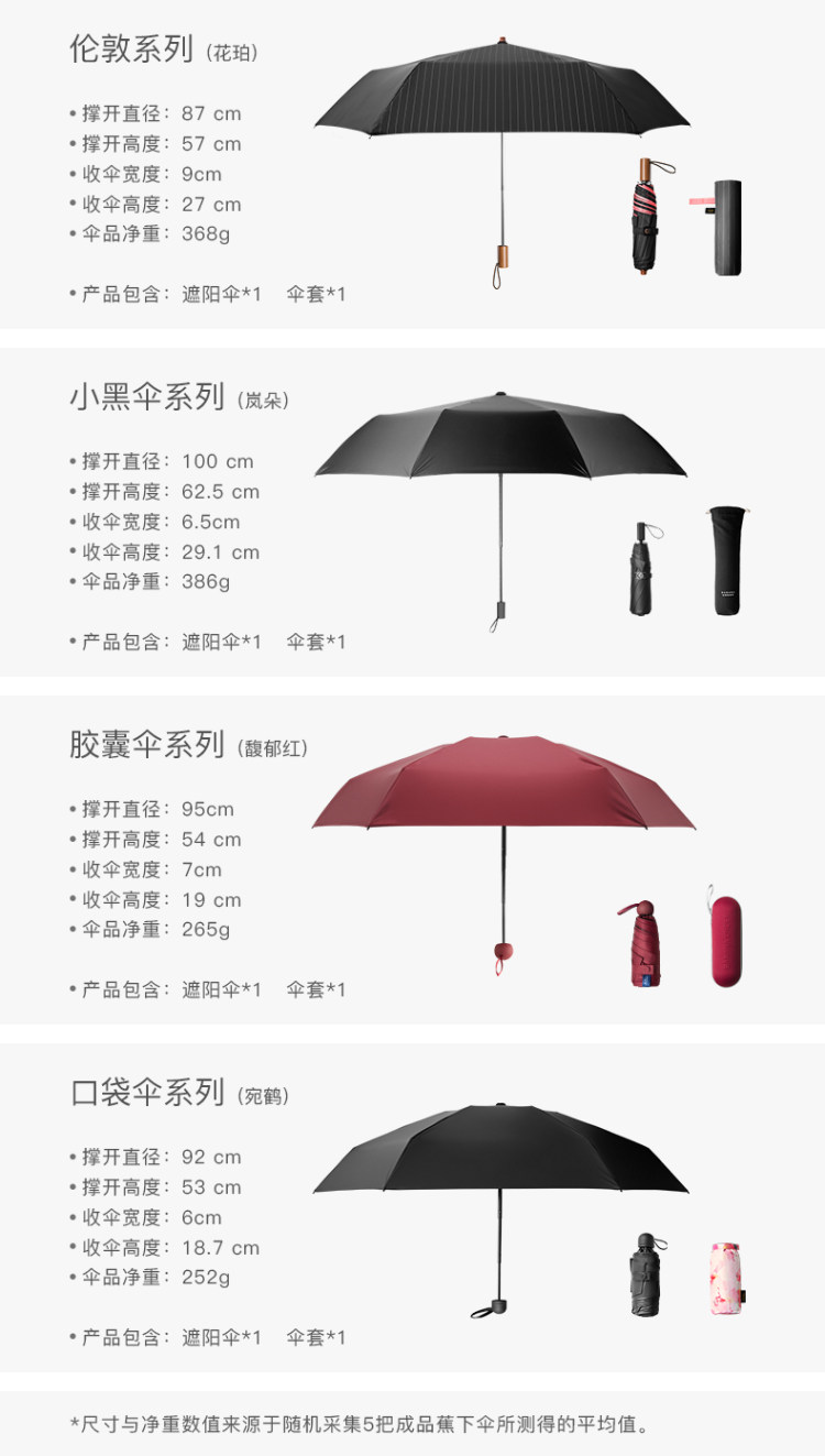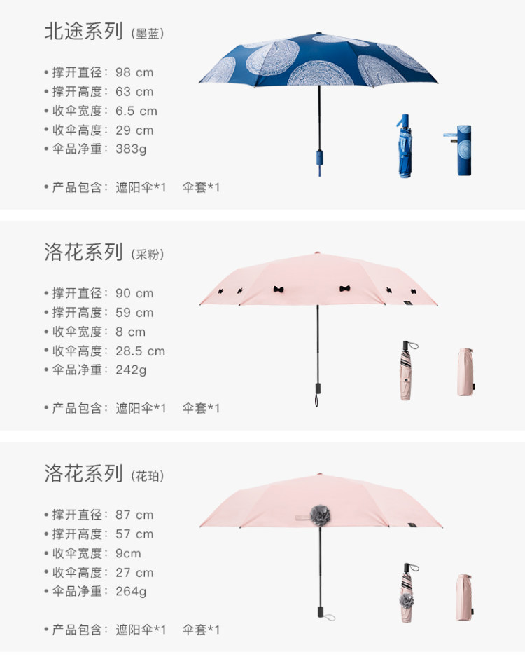 铝合金制成的伞棒,坚韧耐用不生锈;传统手柄,握感舒适不摩手,拉扣式伞带,伞面撑开直径87cm,伞顶到伞手柄长度57cm,收起后的长度为27cm,配伞套。