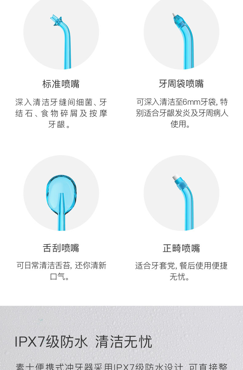 天猫素士旗舰店269元,可领50元优惠券,实付219元到手,第一款此价,有4种喷嘴,还有电动牙刷+水牙线的组合可选。清新小蓝瓶素士便捷式冲牙器,微型温和水柱,适合亚洲人的口腔,三档清洁模式,循序渐进清洁牙齿,230ml水箱无需频繁加水,齿间按摩,瞬时净爽,比牙线棒更舒适,舒适按摩牙龈,还你健康口腔。