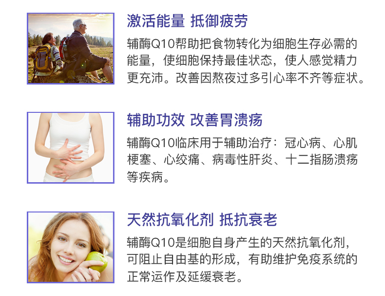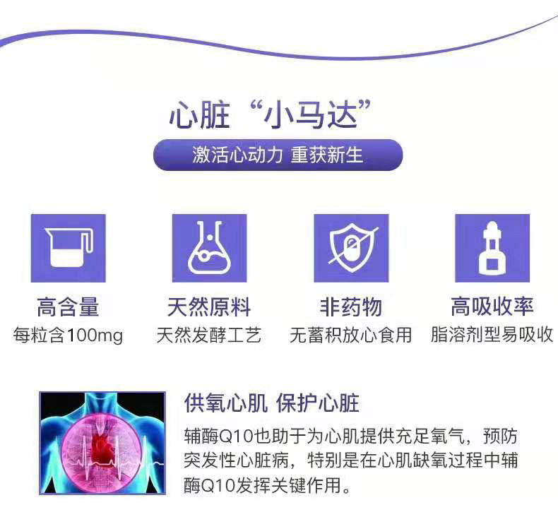 辅酶Q10又名泛醌,广泛存在于人体组织器官。Q10堪称心保健领域最伟大的发现之一,普遍存在人体细胞中,尤其是心脏中含量最高,辅酶Q10可强化心脏机能,缓解缺氧状况,因此称为“心脏活力之源”。可用于日常心脏的保健,抵御疲劳,抵抗衰老,改善胃溃疡、冠心病等疾病的辅助治疗。