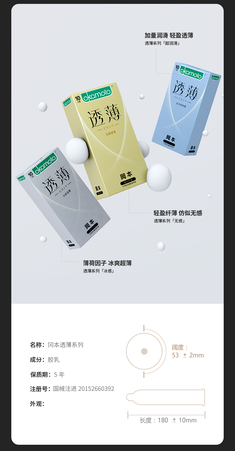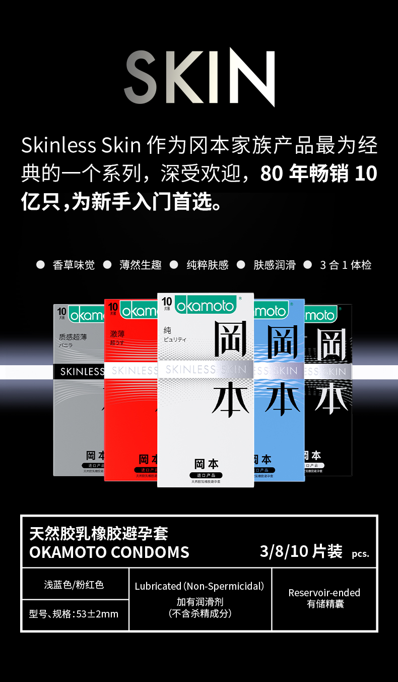 冈本SKIN系列安全套由冈本株式会社泰国全资工厂生产,是冈本系列产品销售数量最多的系列产品,SKIN系列秉承了冈本产品轻薄、柔软的热点。