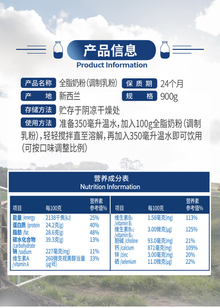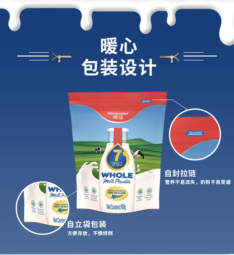 天猫超市59.9元,可领20元优惠券,实付39.9元到手;这款Weidendorf 德亚 全脂调制奶粉,规格900g/袋,新西兰原装进口,生产和品质监管符合新西兰高标准,通过新西兰食品安全体系认证,产地锁鲜&现代化喷粉技术,原生高钙含量871mg/100g,营养丰富,自立袋包装,方便存放,不惧倾倒,带自封拉链,营养不易流失,奶粉不易受潮。