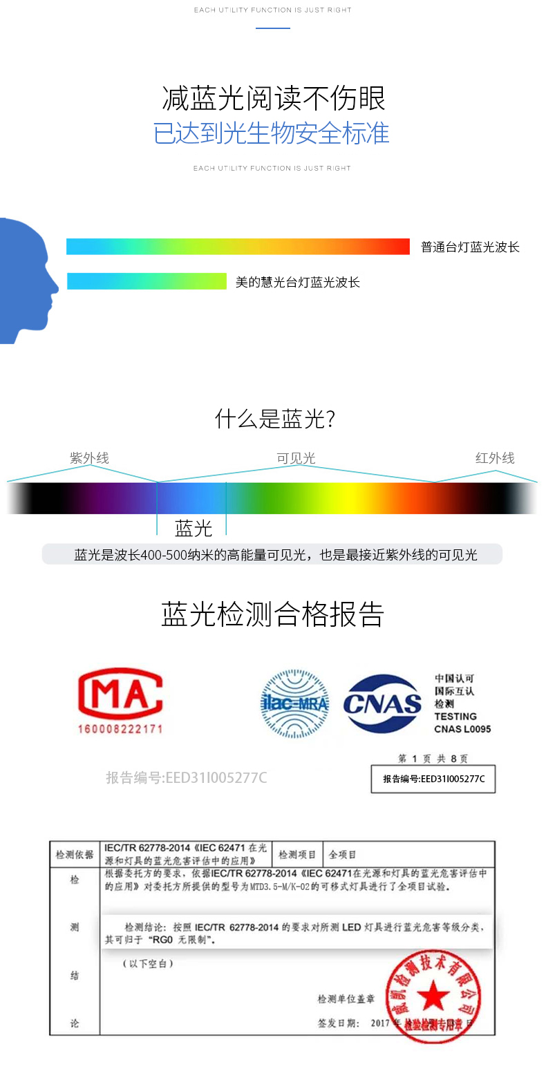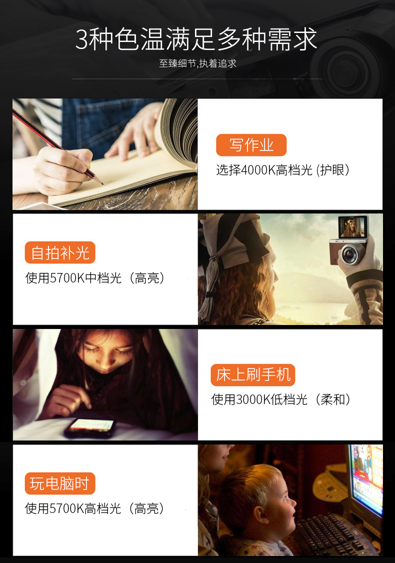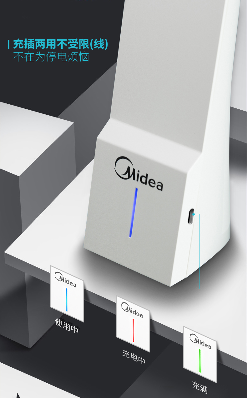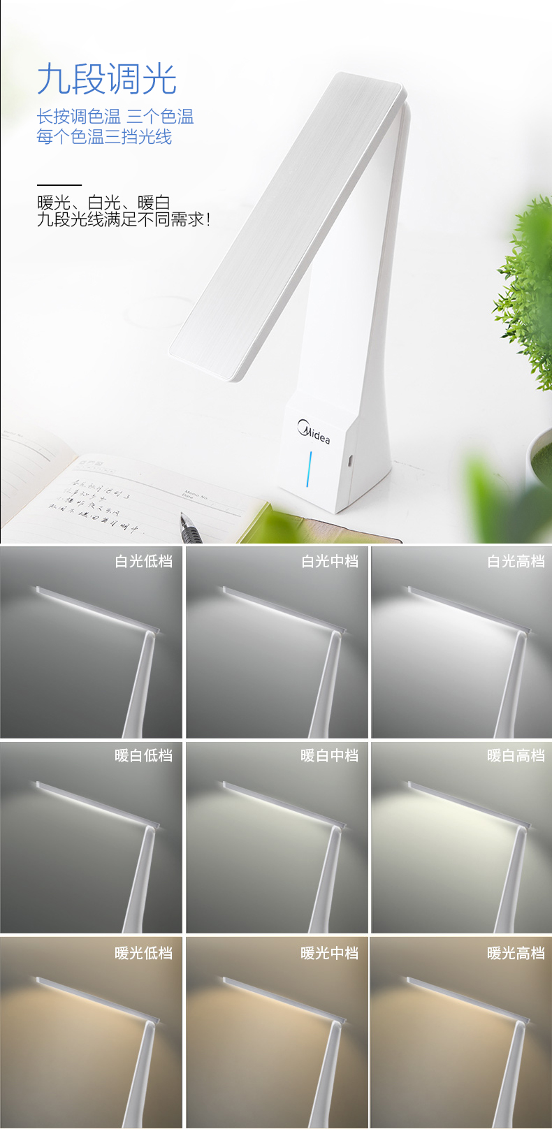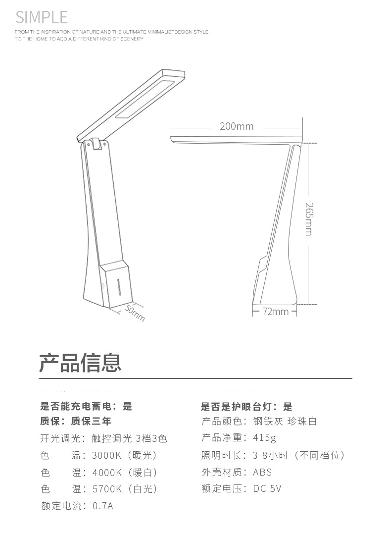 内置优质锂电池,满电状态可持续8个小时,触摸式感应开关,9个档位的光线任你选择,充插两用,普通LED台灯,过量蓝光进入视网膜,会造成视网膜损伤。灯背采用抗氧化处理工艺,抗腐蚀抗划伤能力更强,看起来更加美观,充满机械科技感。