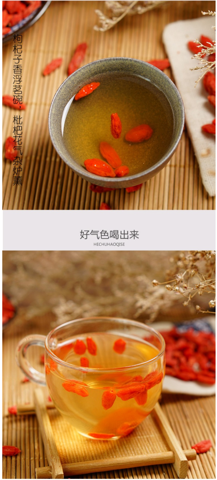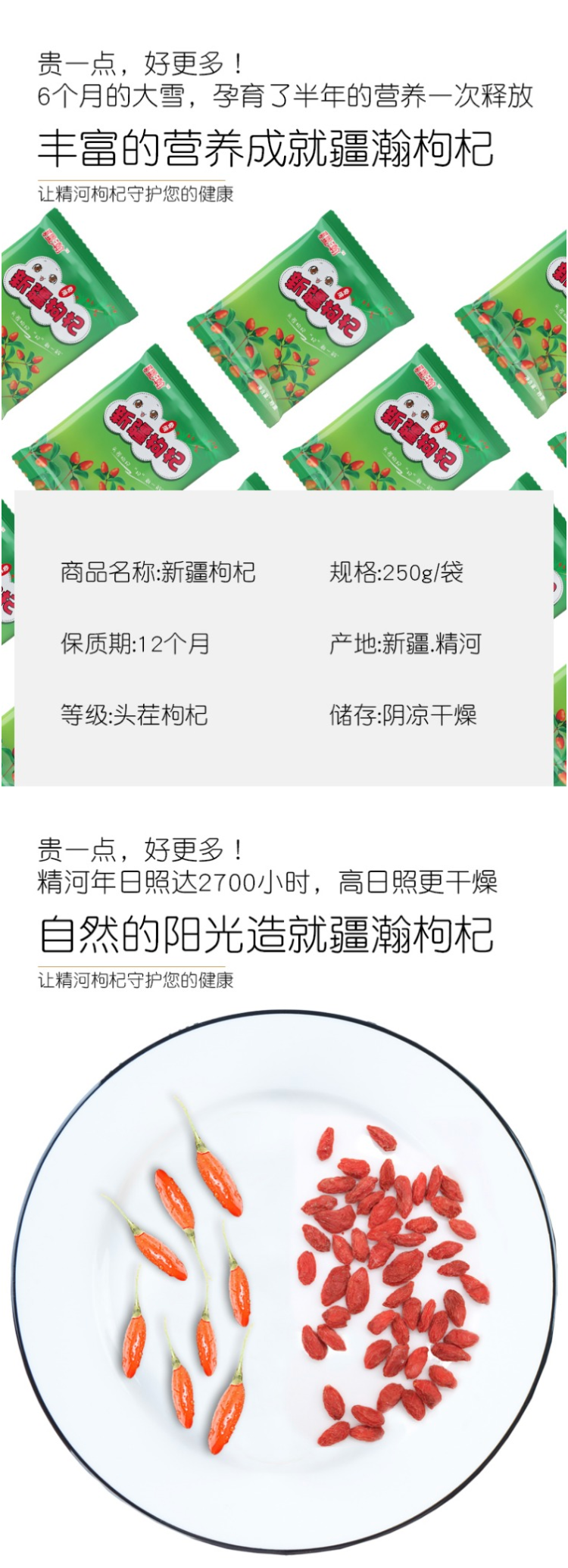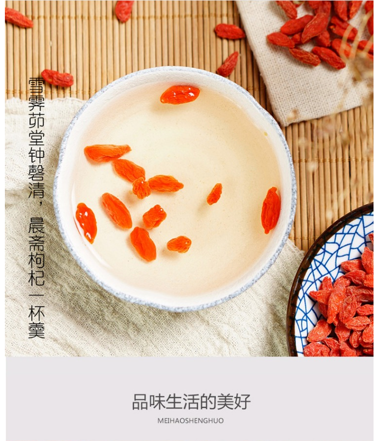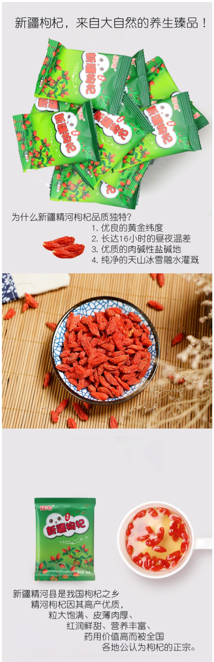 此款枸杞产自新疆精河,生长于无污染的荒漠,由天山冰川雪水灌溉,含有更高的钙、铁等营养元素。日照时间长达15小时,光合作用更充分,口感更甜。天然晾晒,绝对没有经过硫磺处理,不染色,可直接食用。