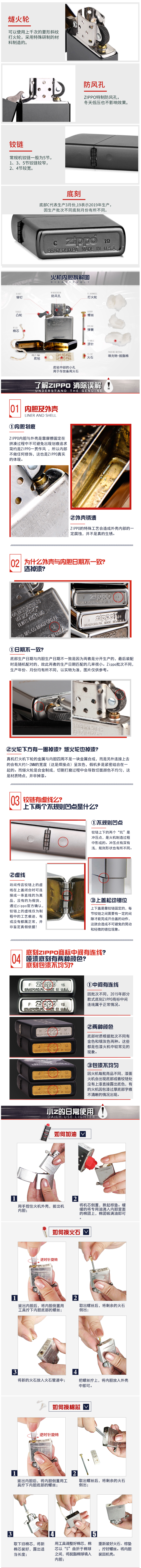 5节开盖铰链,开合顺畅。用特殊材质制造的打火轮,可以使用7.3万次,火轮上还有菱形斜纹,不滑手。拥有经过精密计算的16个防风口,能在任何恶劣天气下尽情燃烧。底部有Zippo的Logo,同时字母D代表4月份,18代表2018年生产,整重55g。