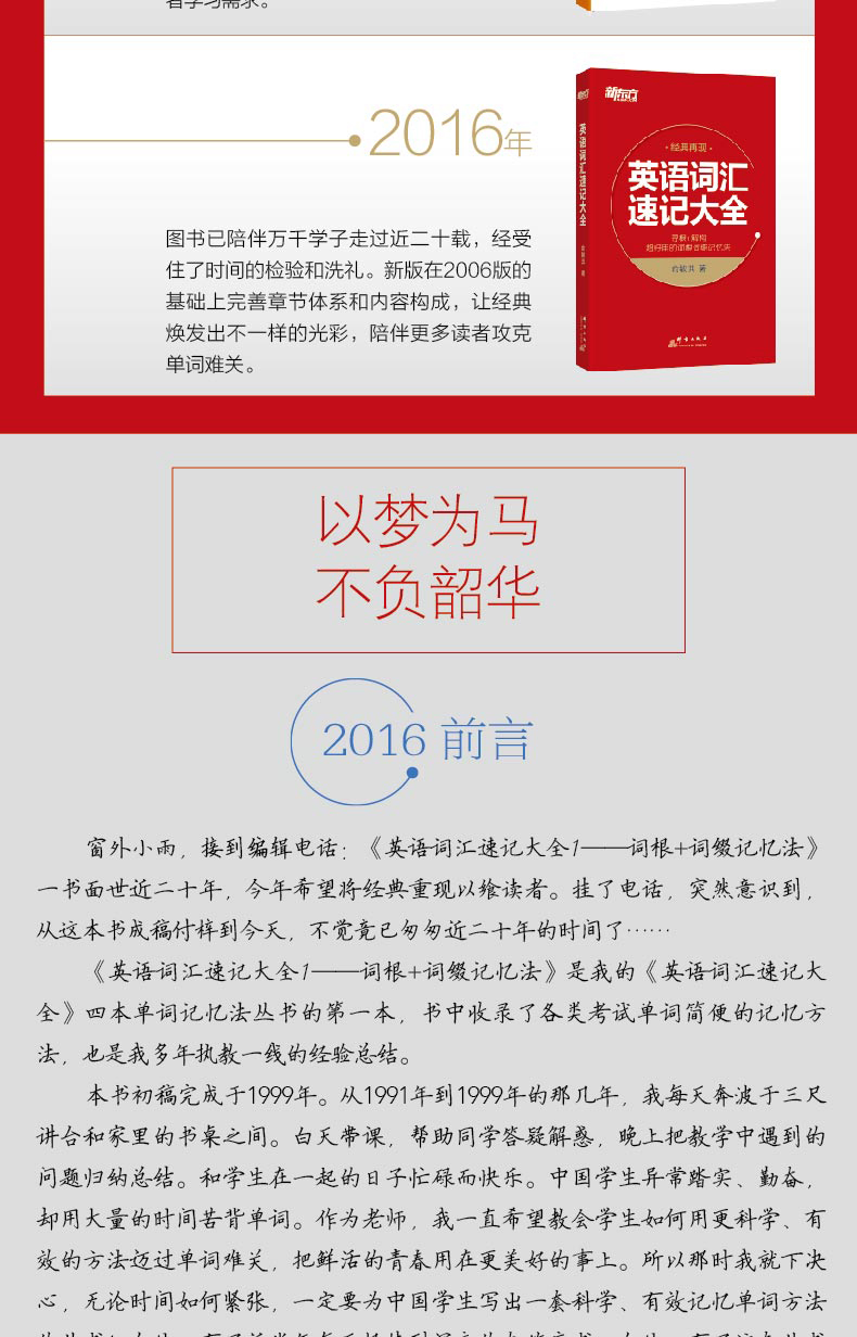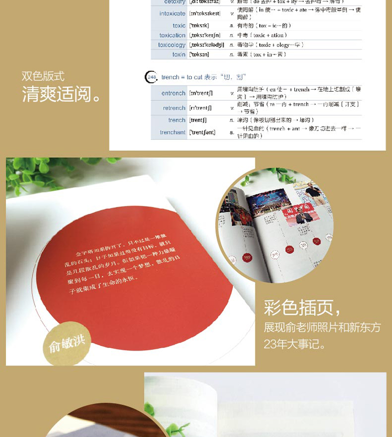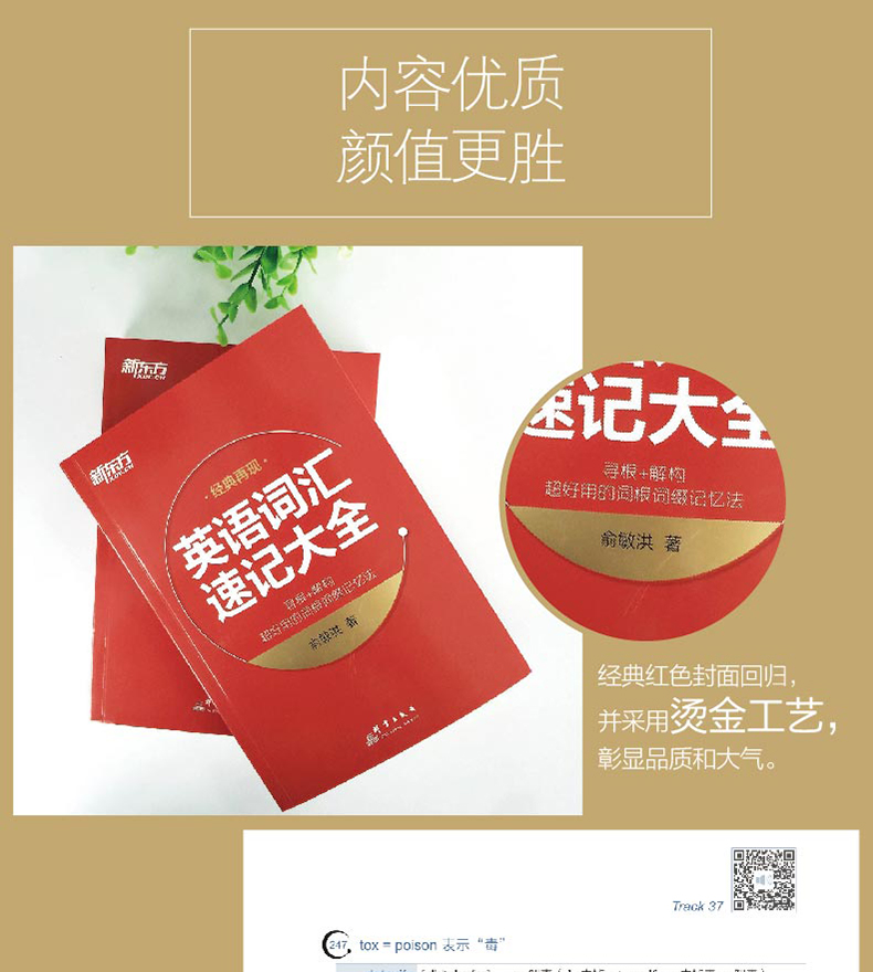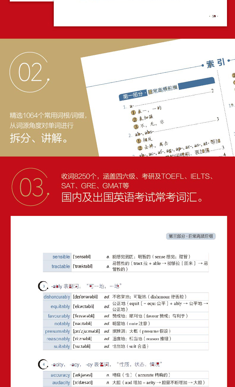 《英语词汇速记大全》精选1064个常用词根词缀,从词源角度对单词进行解构,让读者真正了解单词构成,摆脱死记硬背的状态,尽早进入科学、高效的记单词阶段。优化词根、词缀分类,按难易程度划分为日常高频和核心进阶两类,使读者既可循序渐进地学习,也可根据个人水平有针对性地使用。全书收词8250个,涵盖四六级、考研等国内英语考试核心词汇及TOEFL、IELTS、SAT、GRE、GMAT等出国考试常考词汇。按词根词缀将同源单词一并纳入,群组同源记忆,背单词事半功倍。版式清爽、装帧精良、双色内文、四色图片,为读者带来更舒适的视觉享受和更愉悦的阅读体验。