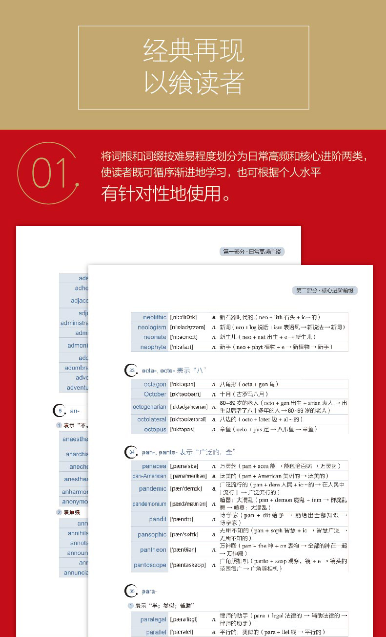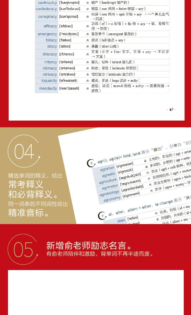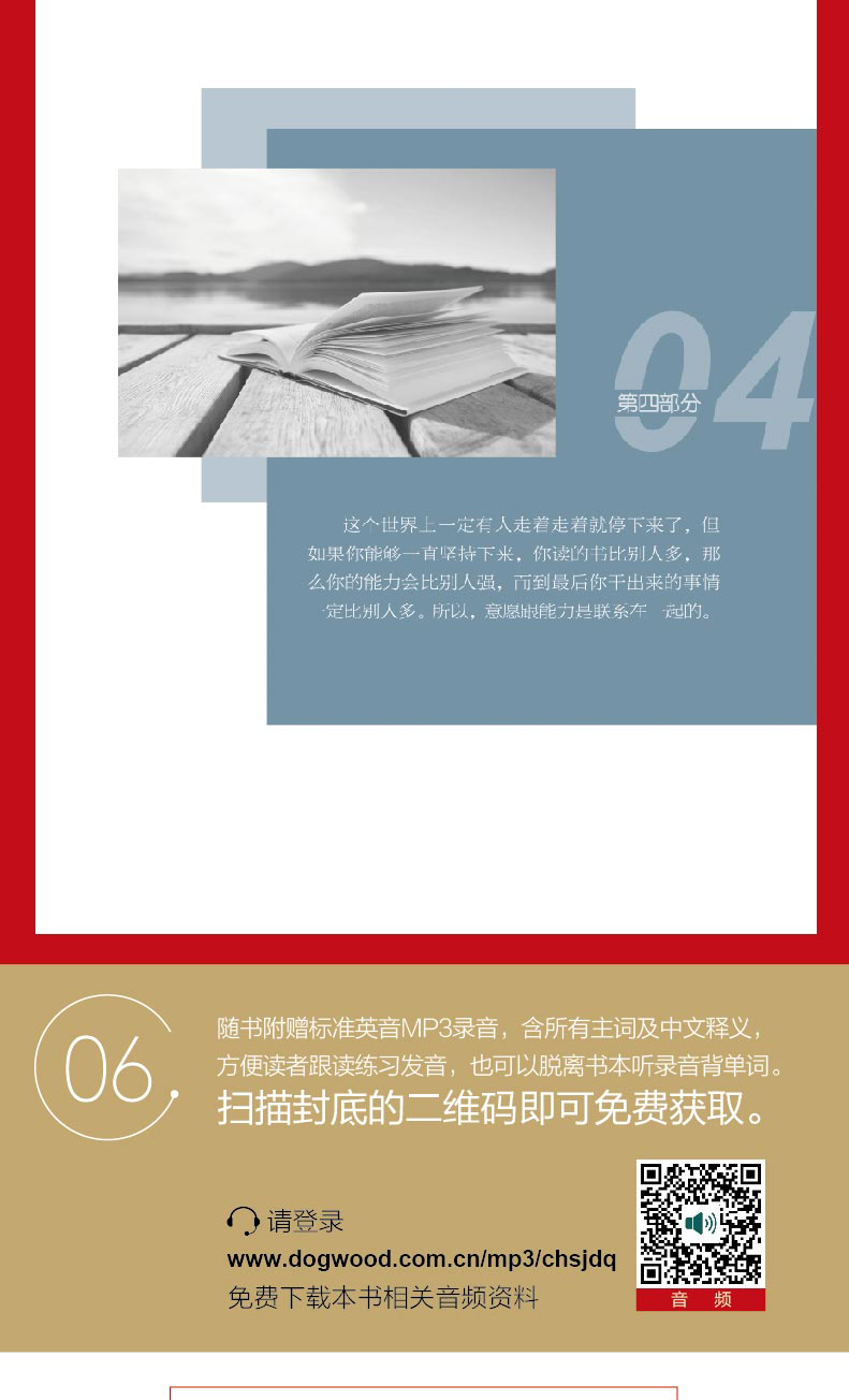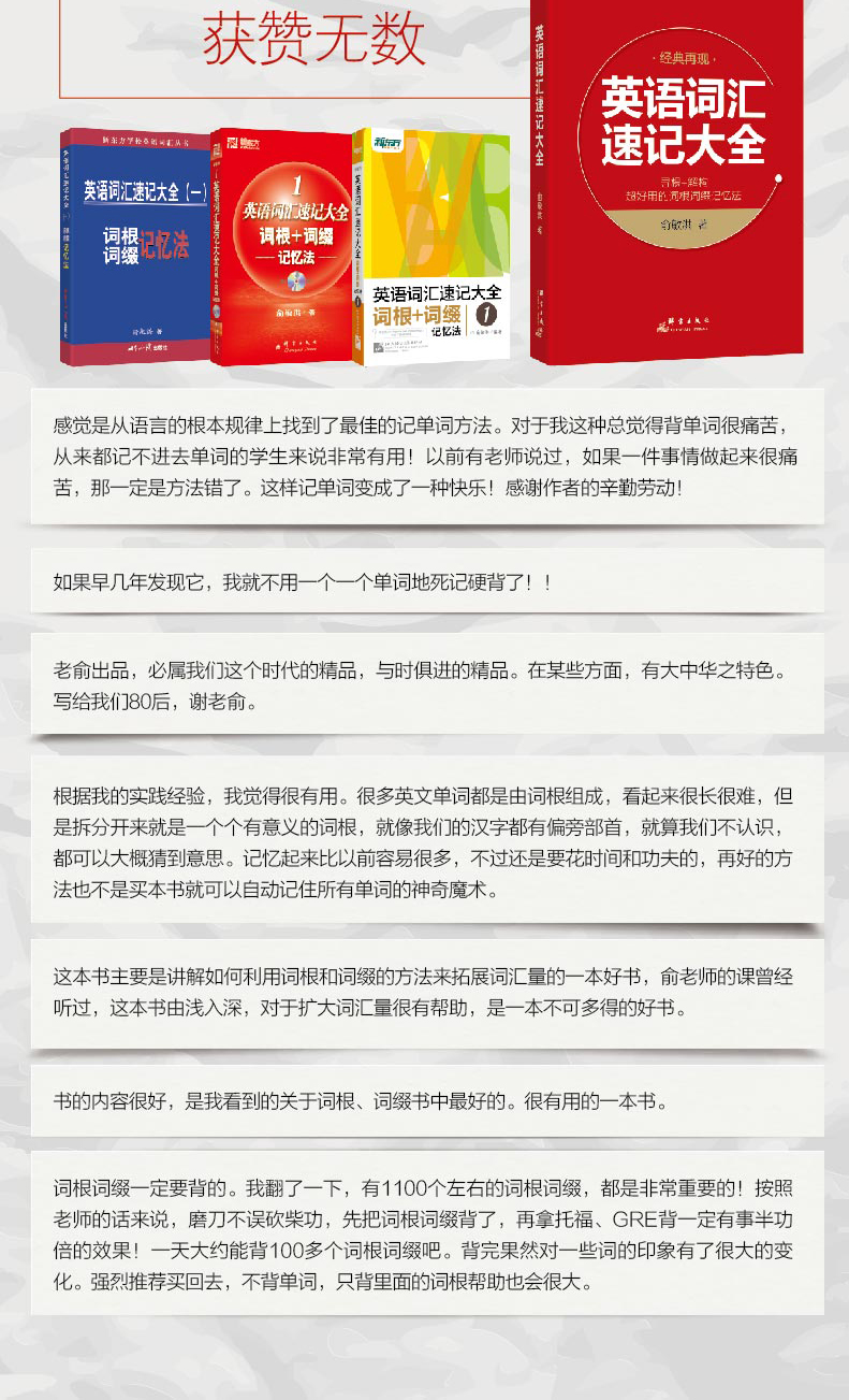 《英语词汇速记大全》精选1064个常用词根词缀,从词源角度对单词进行解构,让读者真正了解单词构成,摆脱死记硬背的状态,尽早进入科学、高效的记单词阶段。优化词根、词缀分类,按难易程度划分为日常高频和核心进阶两类,使读者既可循序渐进地学习,也可根据个人水平有针对性地使用。全书收词8250个,涵盖四六级、考研等国内英语考试核心词汇及TOEFL、IELTS、SAT、GRE、GMAT等出国考试常考词汇。按词根词缀将同源单词一并纳入,群组同源记忆,背单词事半功倍。版式清爽、装帧精良、双色内文、四色图片,为读者带来更舒适的视觉享受和更愉悦的阅读体验。