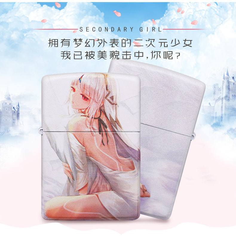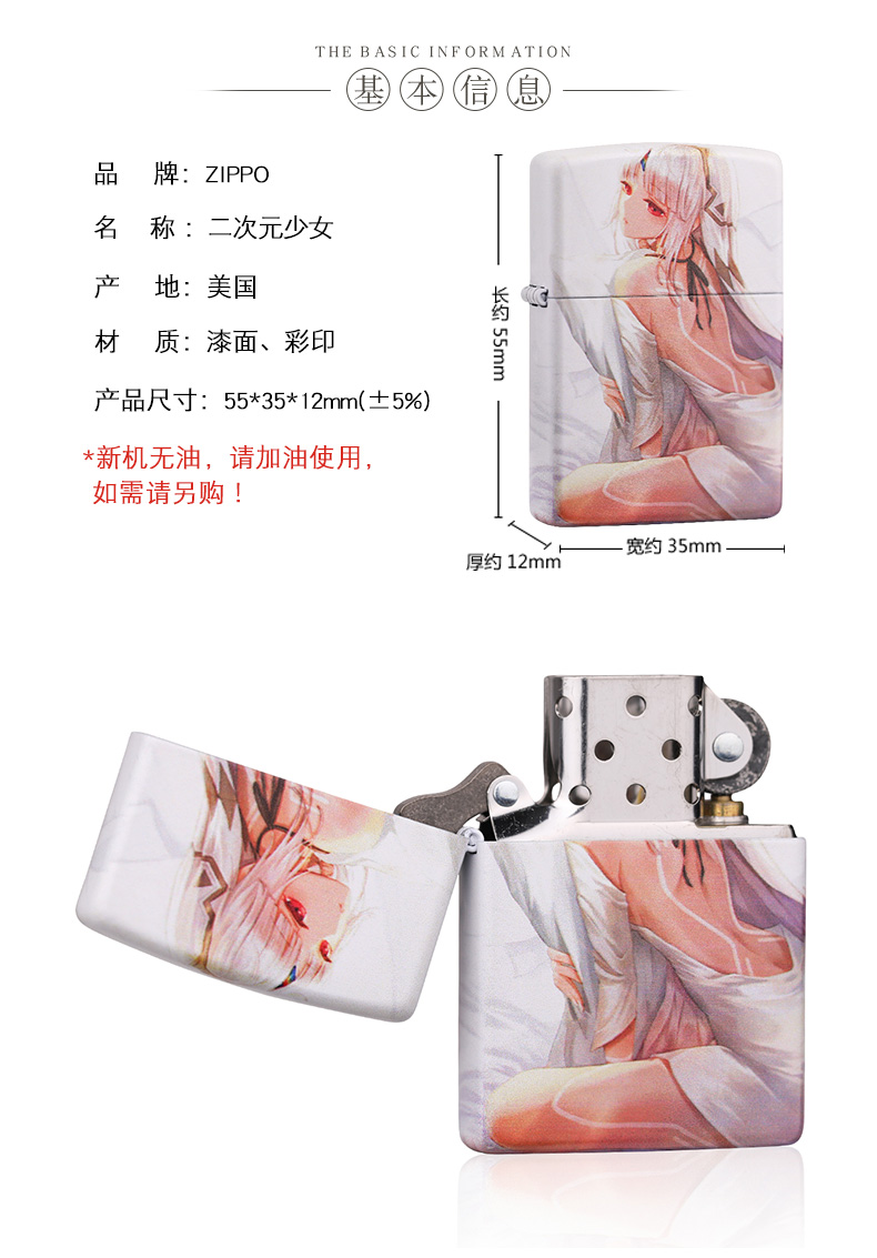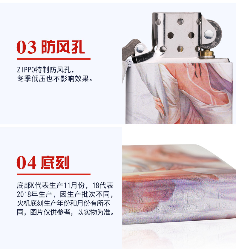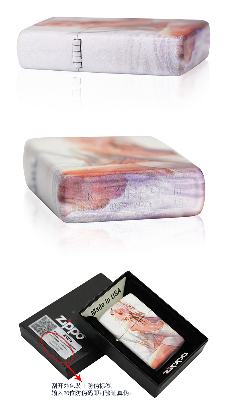 这款Zippo动漫彩印防风打火机,是2019年的新款,主打二次元少女动漫彩印。柔和清新的色彩挟裹曼妙身躯,带来的神秘美感。美国原产(火机底部印有made in USA),刮开外包装上的防伪标签,在官网上输入20位防伪码即可验证真伪。