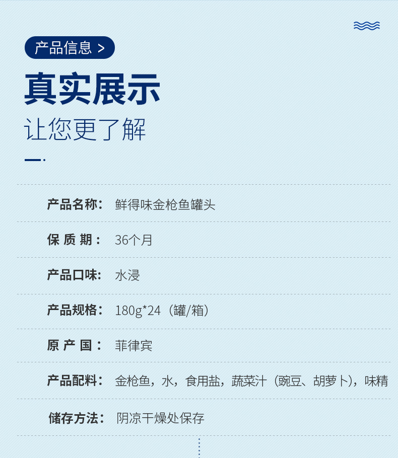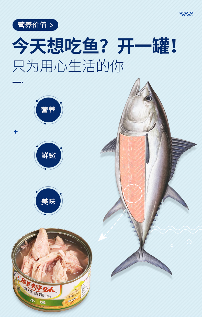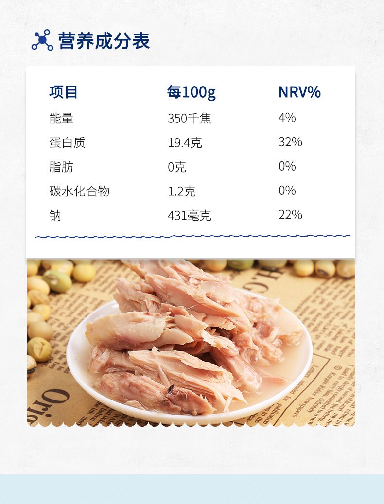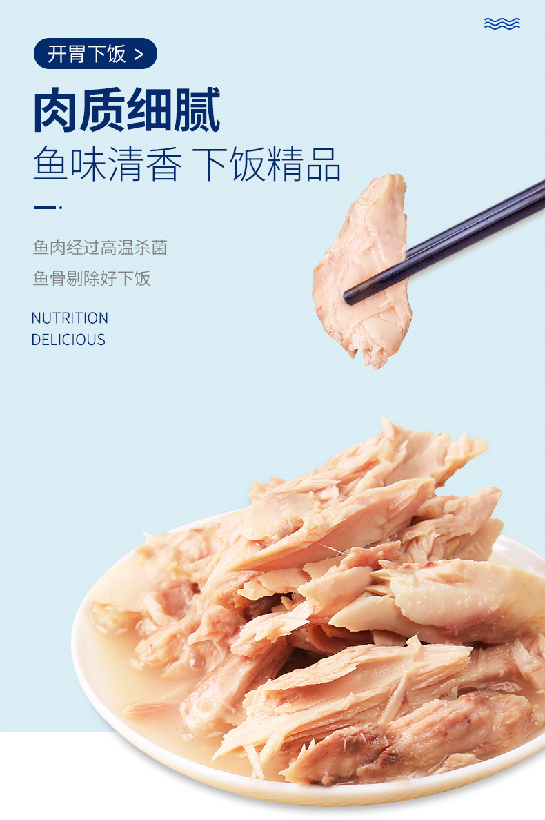 采用高温杀菌模式,保留了鱼肉本身的美味和营养,将鲜度锁于罐内,无需防腐剂,也能达到长久保鲜的目的。高温真空罐装,用矿泉水浸,可放心食用。
