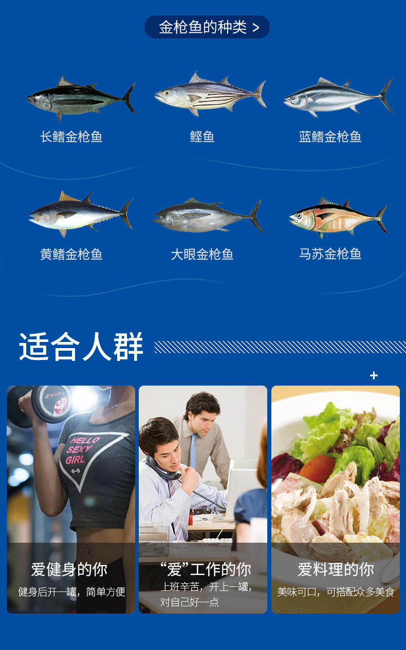 金枪鱼又叫鲔鱼,香港称吞拿鱼,是一种大型远洋性重要商品食用鱼,鱼肉低脂肪、低热量,适合增肌和瘦身人士服用,富含蛋白质、EPA、氨基酸、维生素D,钙、磷、铁等矿物质含量也较高。