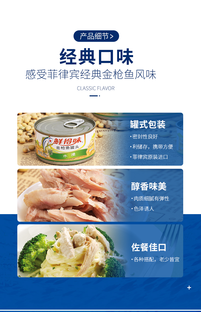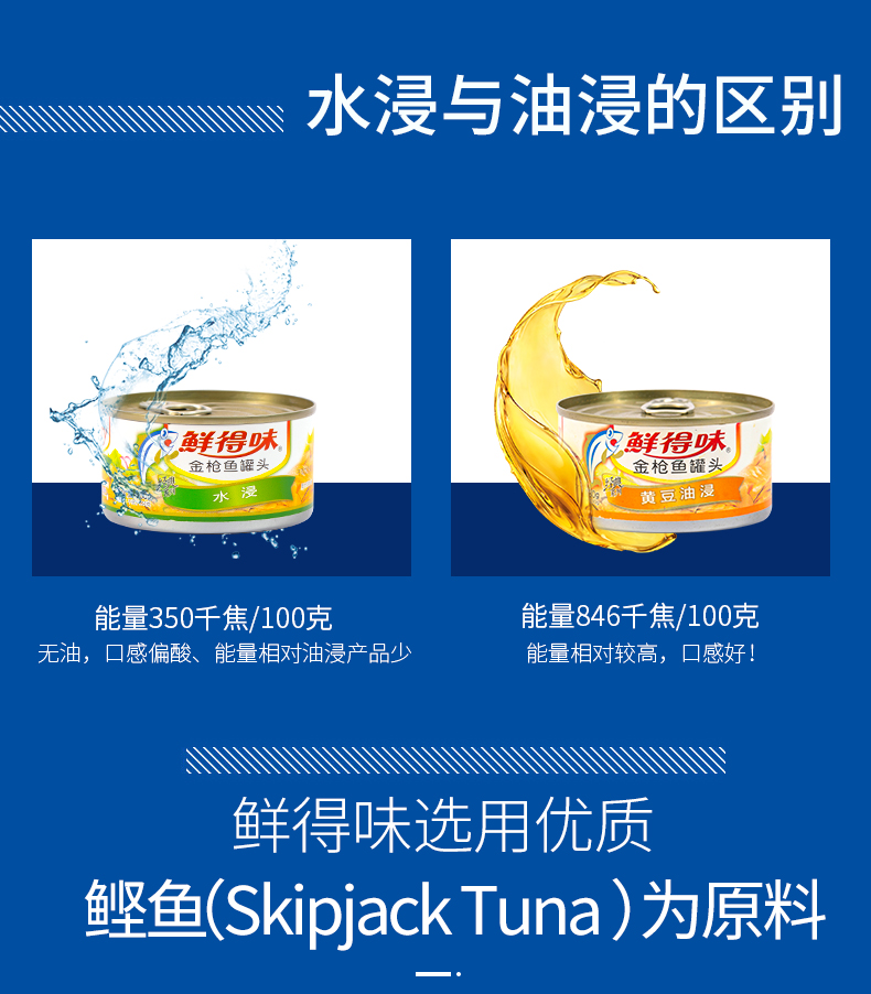这款鲜得味 水浸金枪鱼罐头,生产日期是2019年9月。选用从菲律宾深海捕捞的天然野生金枪鱼(鲣鱼)的鱼排部位,0脂肪含量,鱼肉色泽鲜黄,肉质细嫩有嚼劲,完整的大块金枪鱼肉,非碎肉。