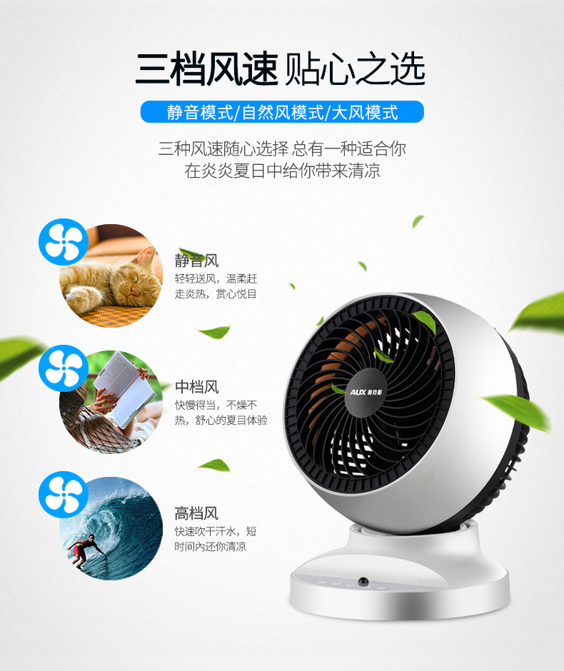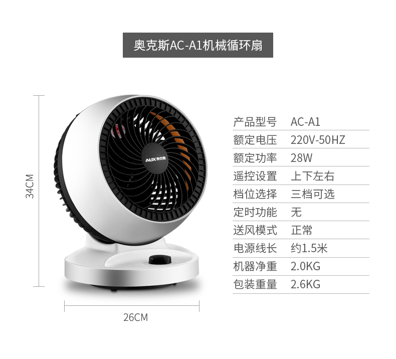 这款奥克斯AC-A1空气循环扇,上下左右(60°左右自动摇头,90°上下手动调节摇头),广角送风,可以使得室内空气,循环流动起来,把底部的冷气,往上吹;旋涡气流,出风量大,风感细密绵柔,不吹人;可配合空调、取暖器和空气净化器使用。