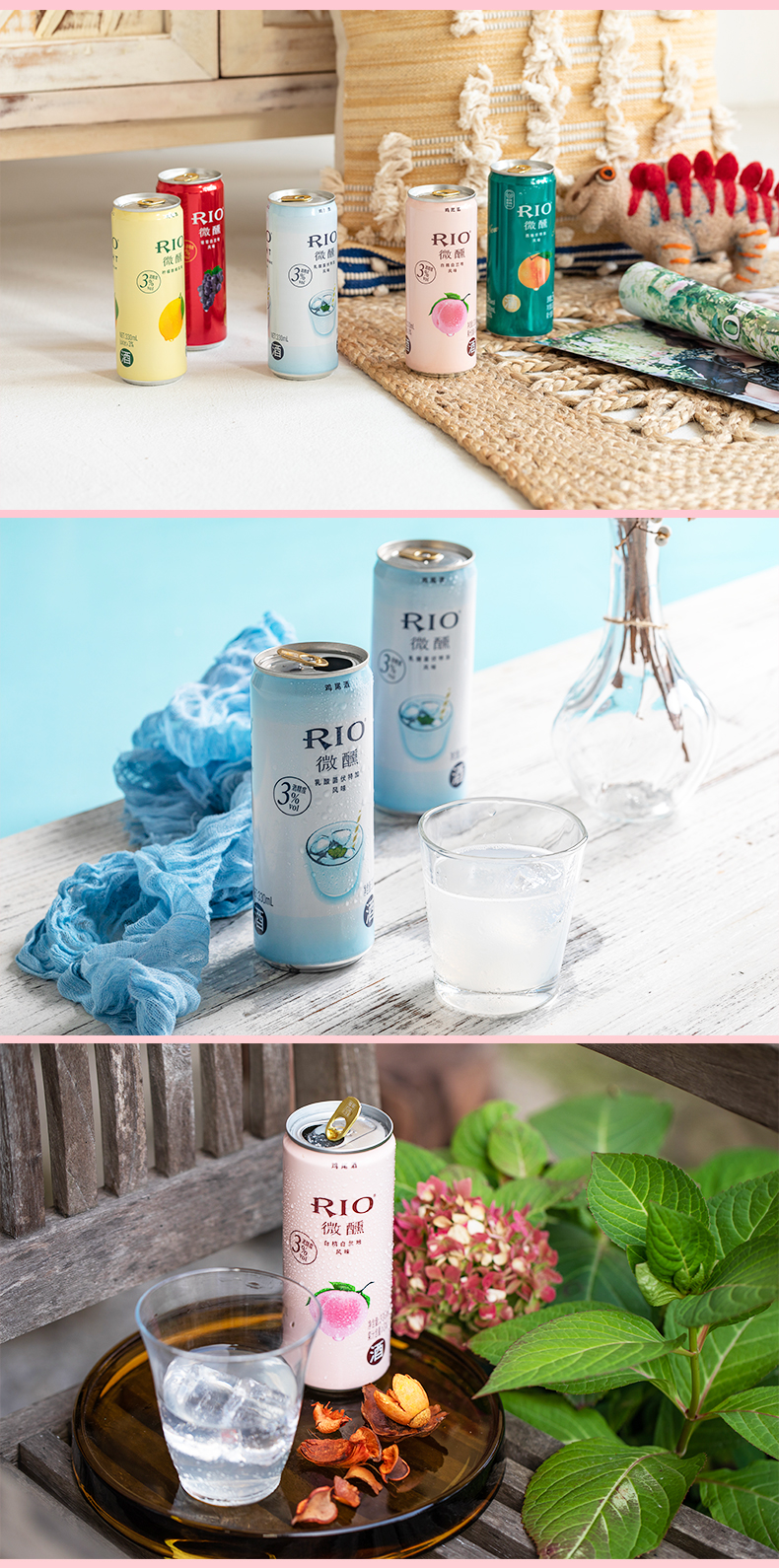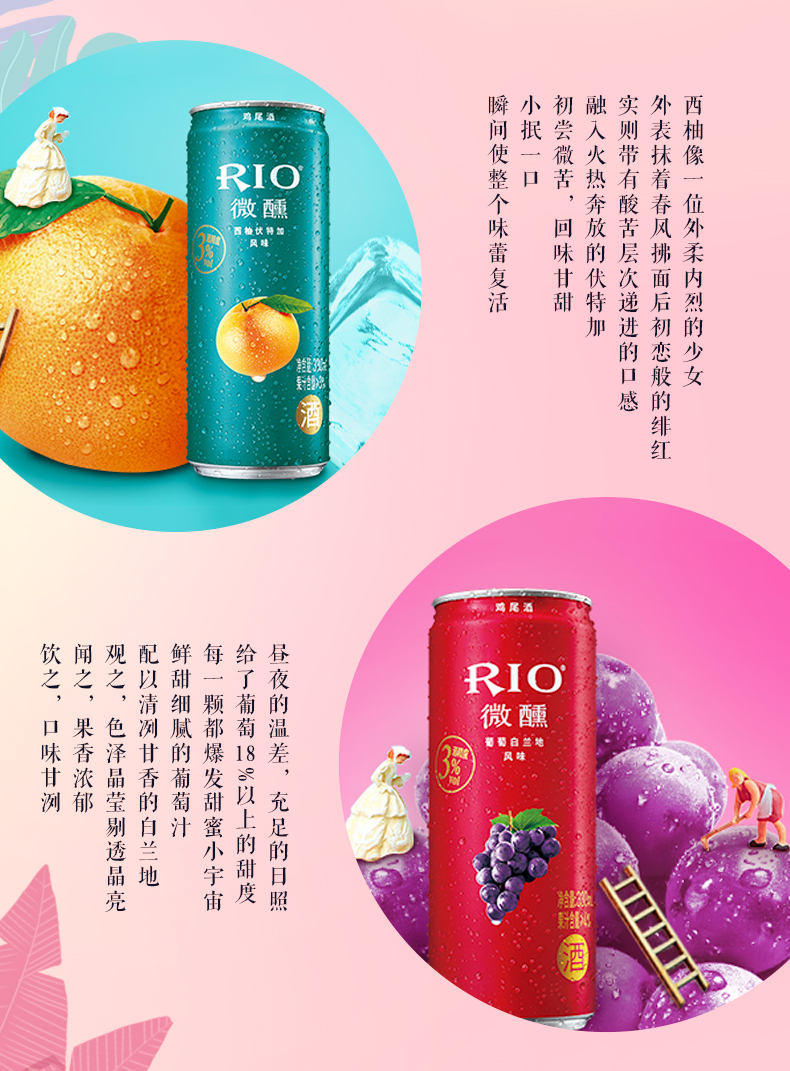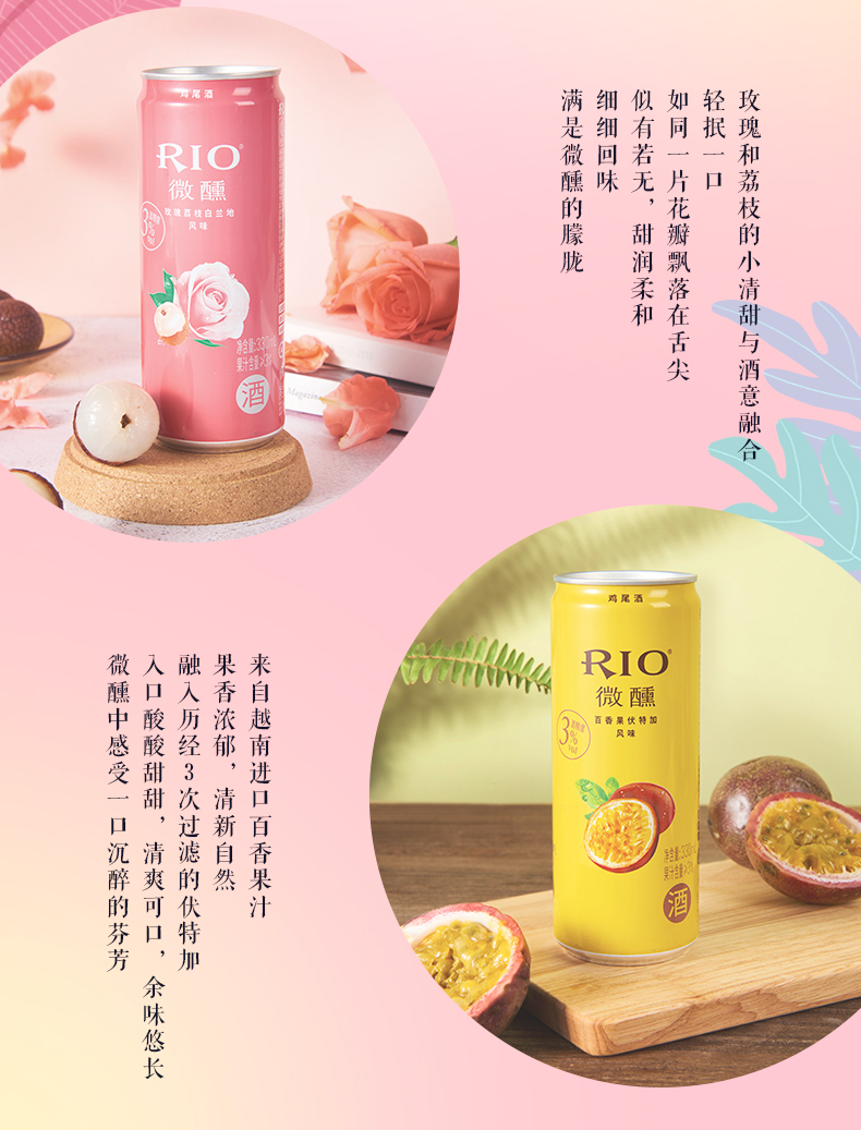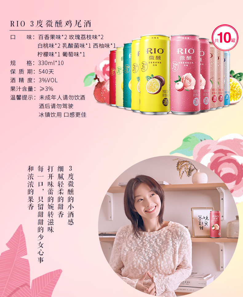 Rio新品3°微醺,目前最有名的预调制鸡尾酒品牌之一,7口味组合装,有百香果口味、玫瑰荔枝味、白桃味、乳酸菌味、葡萄味、柠檬味和西柚味,酒感明快且具有果香,刚刚好的微甜,似醉非醉,余味悠长。