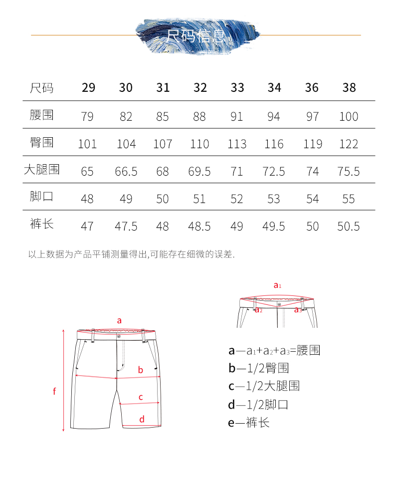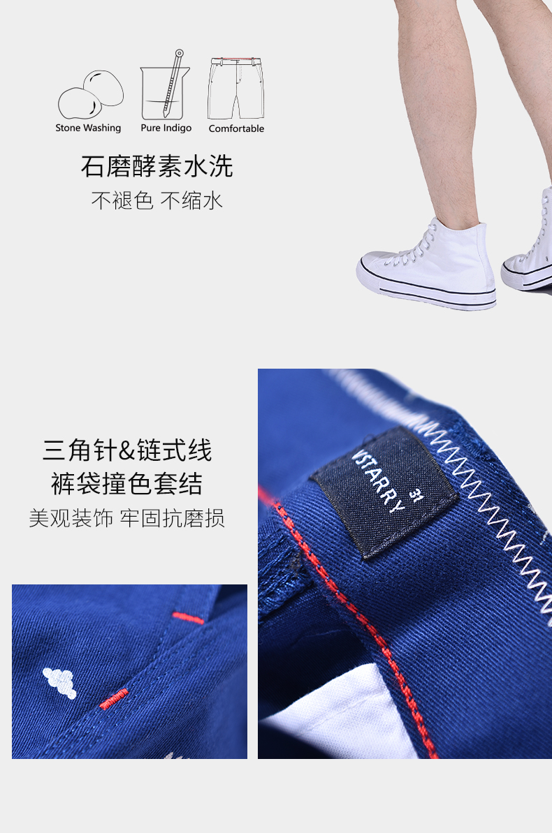 在版型上,修身款式,平齐膝盖。细节上,门襟拉链为高品质日本YKK拉链,提拉顺畅,两侧及臀部后袋都进行了包边处理,不易脱线,整体车工走线精细,耐磨耐穿。经典五分裤设计,夏日百搭穿着