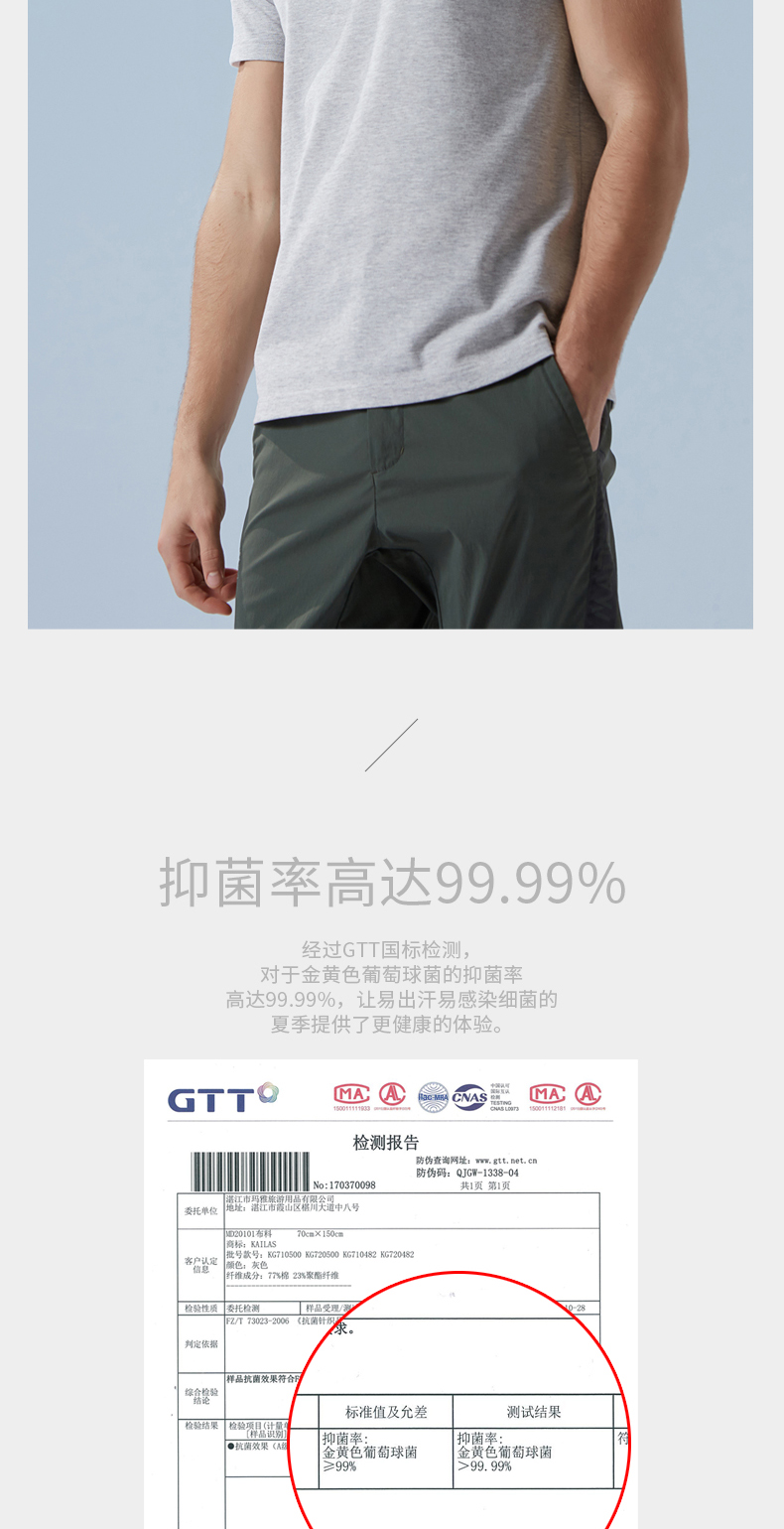 使用专利Wickdry功能性排汗面料,能高效抽离皮肤上的汗湿,透过面料快速蒸发,保持持久的透气干爽,经过抑菌处理,对于金黄色葡萄球菌的抑菌率高达99.99%,持久抑菌驱味。