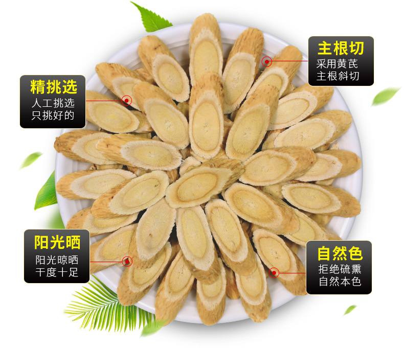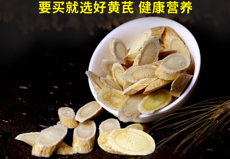 黄芪具有降低血液黏稠度、减少血栓形成、降低血压、保护心脏、双向调节血糖、抗自由基损伤、抗衰老、抗缺氧、抗肿瘤、增强机体免疫力作用,可用来治疗心脏病、高血压、糖尿病等症。黄芪还能扩张血管,改善皮肤血液循环和营养状况,故对慢性溃疡久不愈合者有效。其还能消除肾炎患者的蛋白尿,保护肝脏,防止肝糖原减少。
