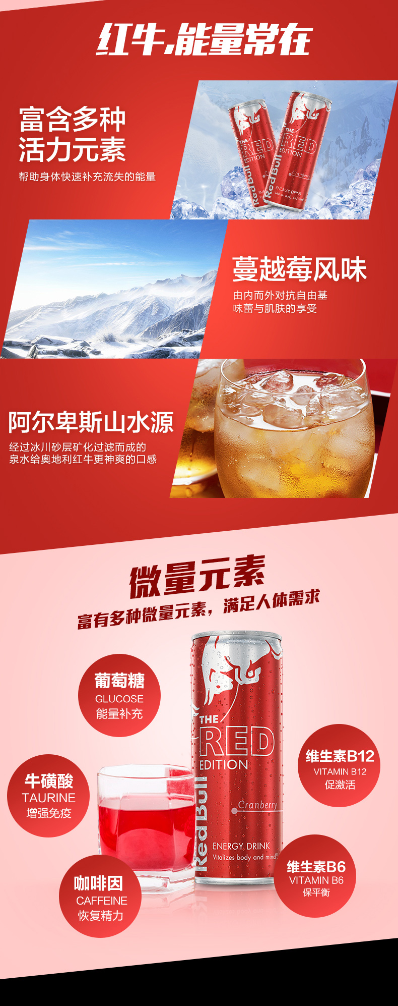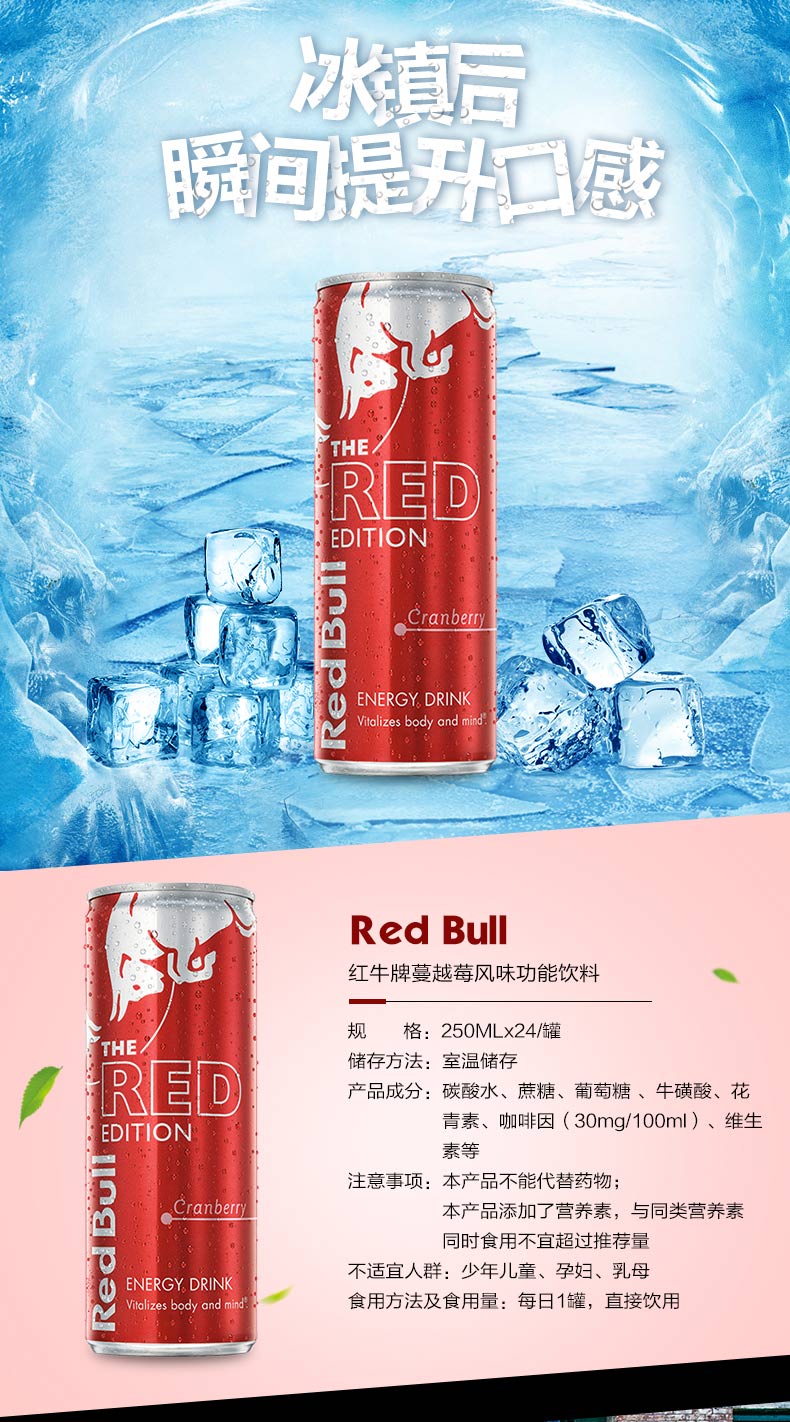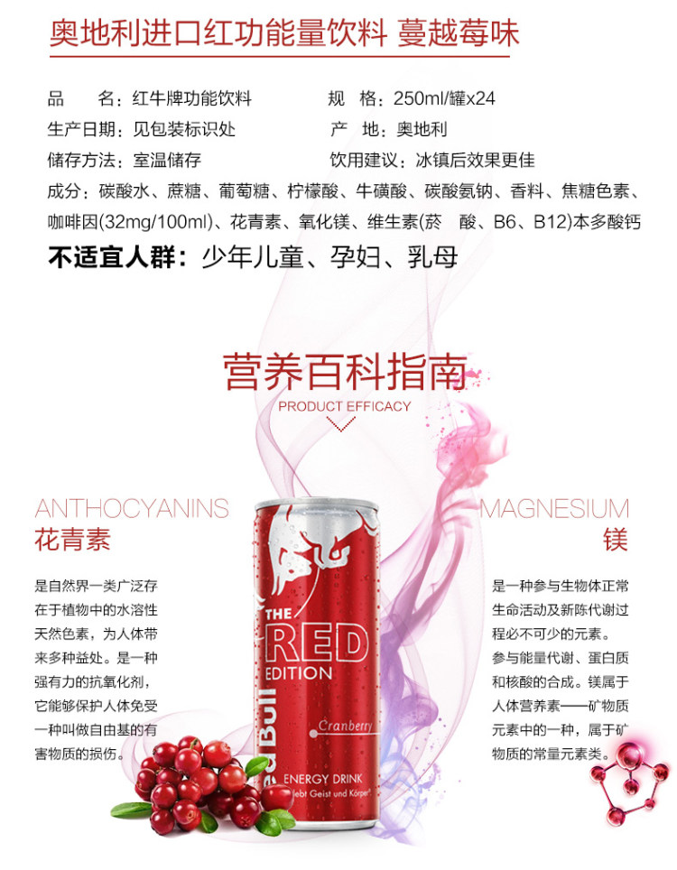 这款红牛 蔓越莓饮料,奥地利进口,蔓越莓口味,特别添加了花青素,具有延缓细胞衰老的功效;采用经过阿尔卑斯山的冰泉水为原料,远离污染和人为接触,流经矿物质层,含有人体所需的微量元素;