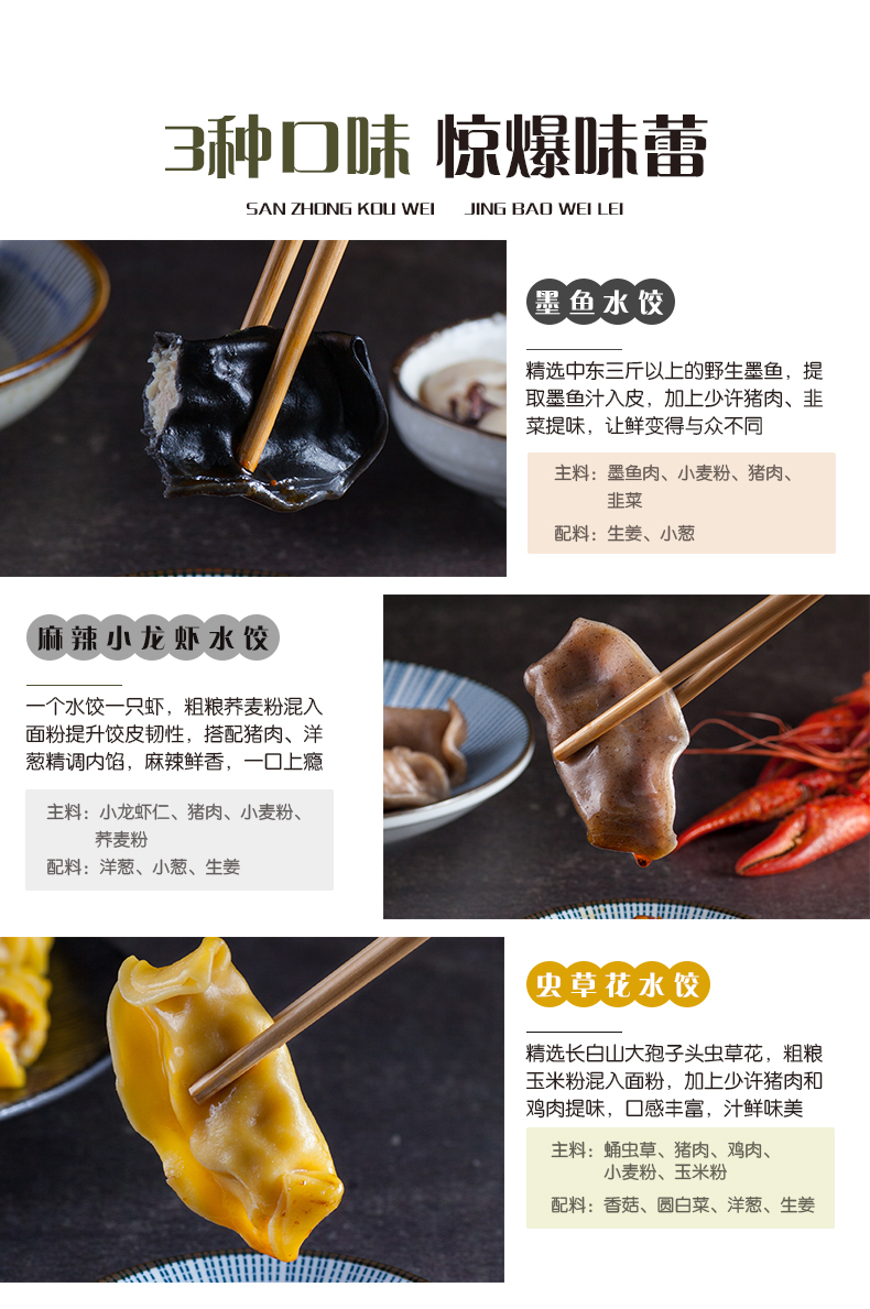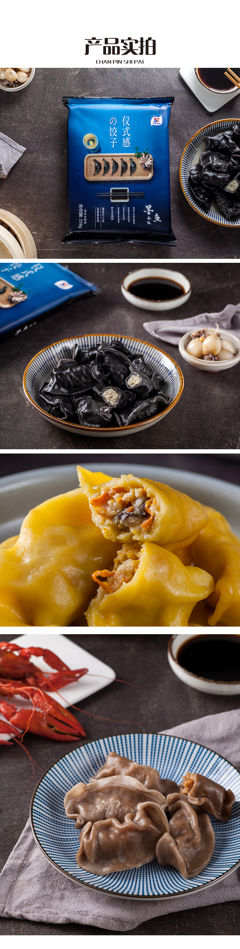墨鱼水饺:精选中东三斤以上的野生墨鱼,提取墨鱼汁入皮,加上少许猪肉、韭菜提味,让鲜变得与众不同。