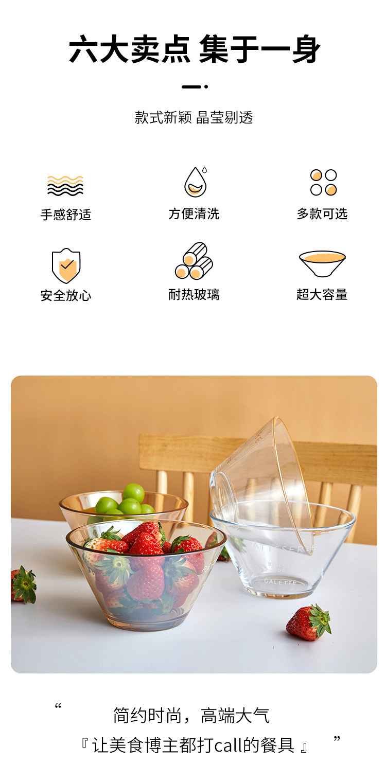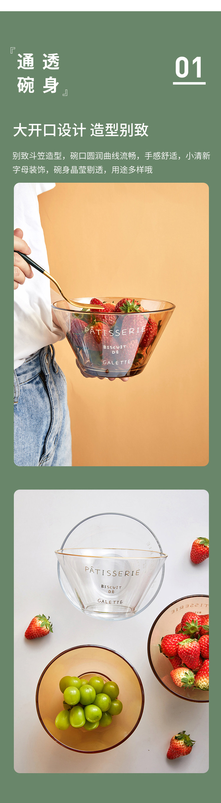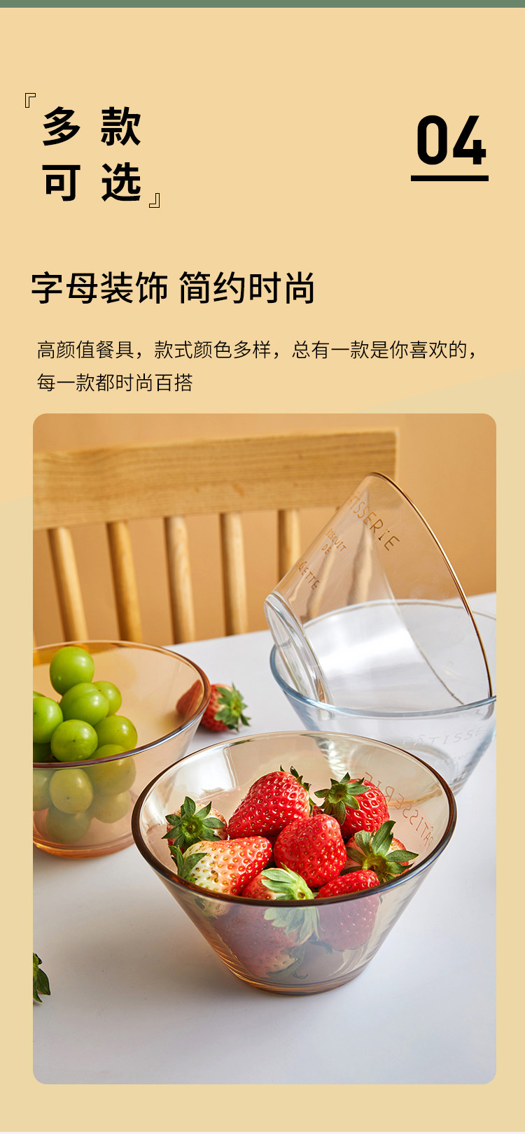 这款玻璃碗使用无铅玻璃为主材质,别致斗笠造型,碗口圆润曲线流畅,手感舒适,小清新字母装饰,晶莹剔透,用途多样。耐热玻璃材质,能承受-20℃~150℃的骤热骤冷环境。