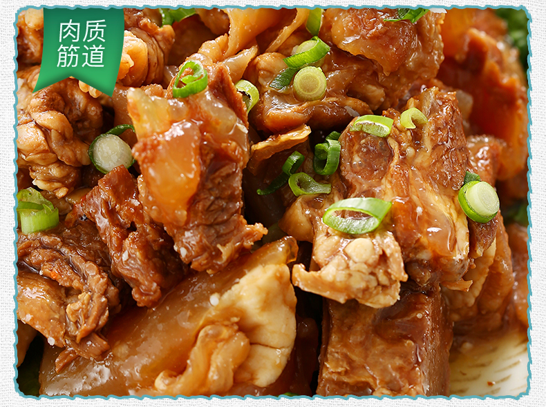 这款筋头巴脑,精选内蒙古大草原天然草饲黄牛,精选新鲜牛肉、牛板筋、牛蹄筋等部位,高汤古法炖制,口感软烂适中,香嫩味美。锁鲜包装,加热即食,吃货必囤!