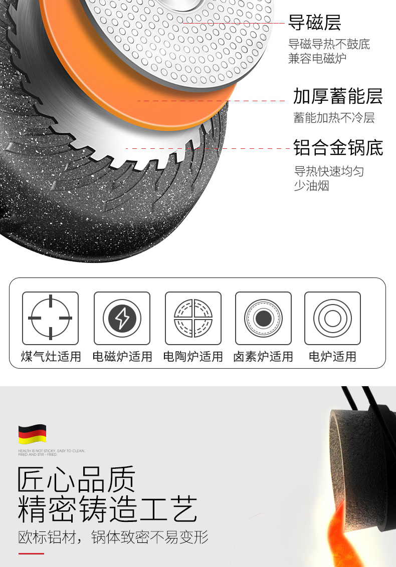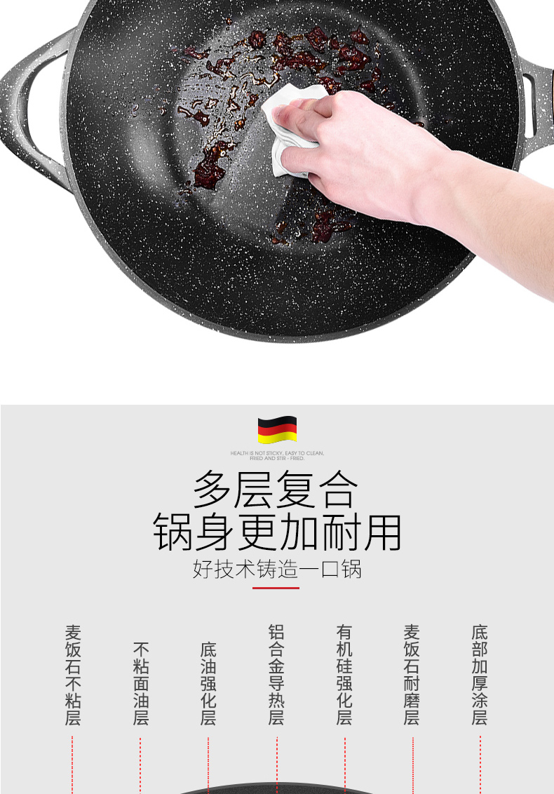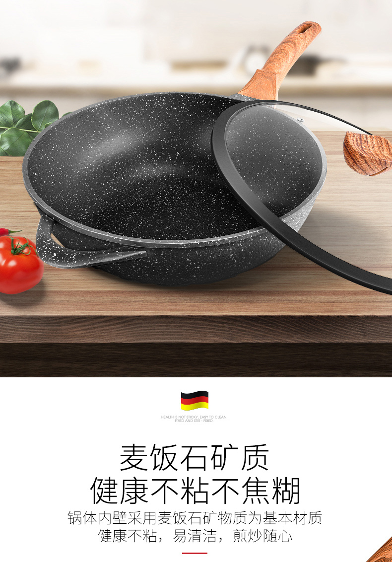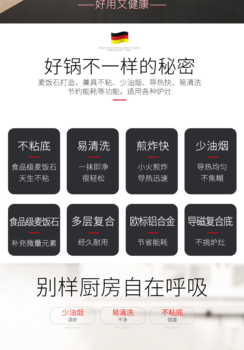 升级麦饭石 健康不粘 少油烟 煎炒两用。
