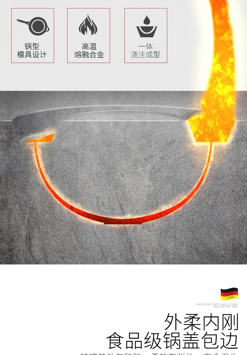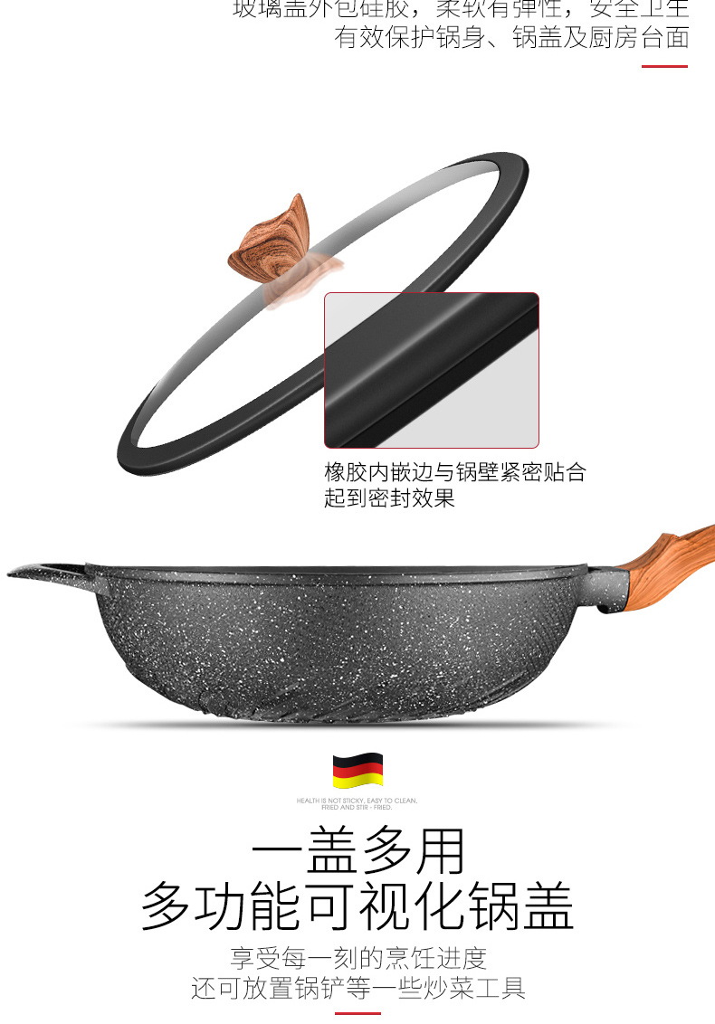 9.5厘米锅深,煎炒蒸煮都能实现。锅体模具采用欧标铝材一体浇筑成型,精密牢固,经久耐用。细节上,可视化钢化玻璃锅盖设计,随时查看锅内情况;人体工学握把,端拿轻松,锅盖边缘采用食品级硅胶包边,密封性好容易焖煮,并防止磕碰,细节精致到位。