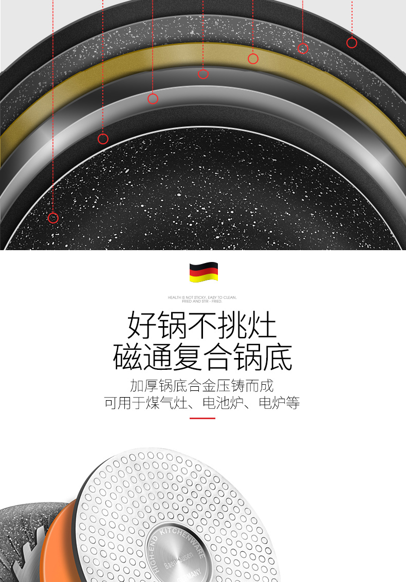 第一款30cm此价,另有多规格可选。这款巴本豪森不粘锅,采用7层铝合金复合锅身设计,符合欧盟、FDA(美国食品药品检验局)等多重卫生标准,健康安全;内里为食品级麦饭石材质,炒菜不易粘锅糊底,且少油烟,易清洗,一抹即净。导磁复合锅底设计,电磁炉、燃气灶等通用。