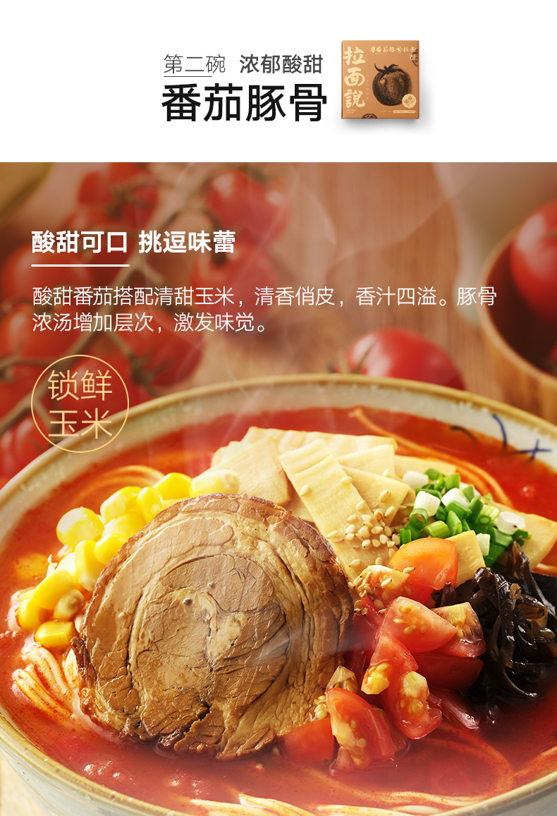 番茄豚骨拉面:选用43只新疆塔里木的番茄,经过6小时慢炖熬制而成的浓郁酸甜。