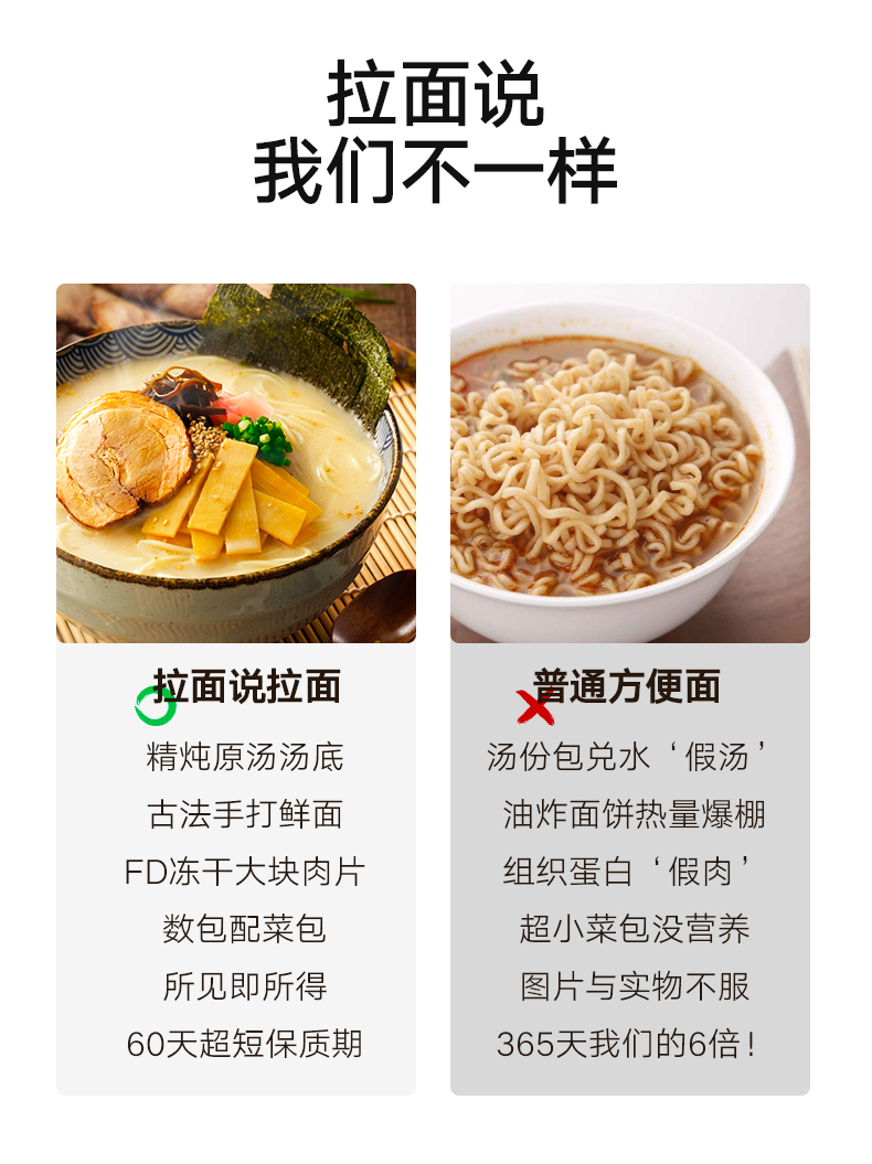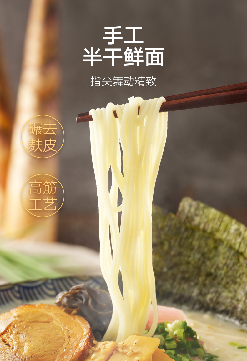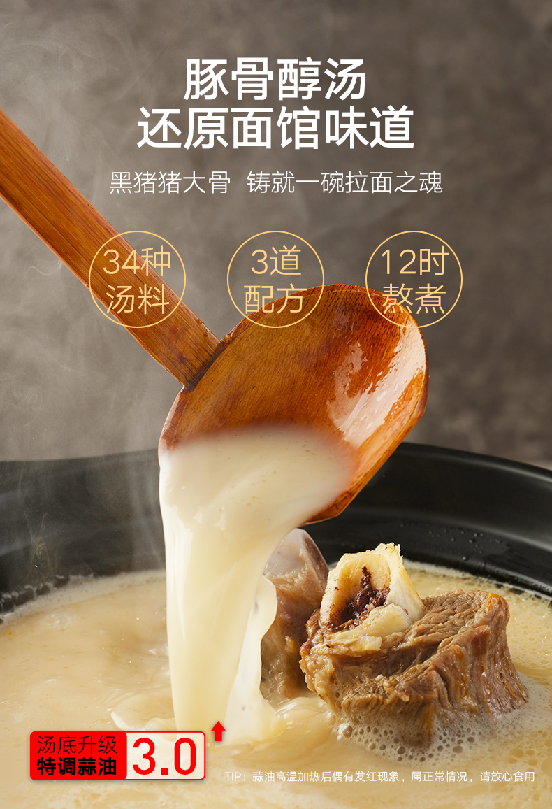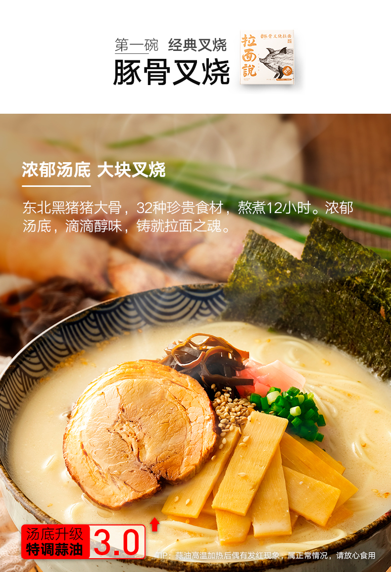 汤底大体决定了拉面的味道,拉面说的汤底通过熬制十几个小时、灌装工艺制得,不添加防腐剂。核心配方从日本企业买断,保证口味独特性。采用半干生鲜面,含水率 20%,保质期 60 天。真的有大块叉烧肉在里面!采用宇航冻干技术保存的大块叉烧肉,既保证肉的口感,也能常温保存。