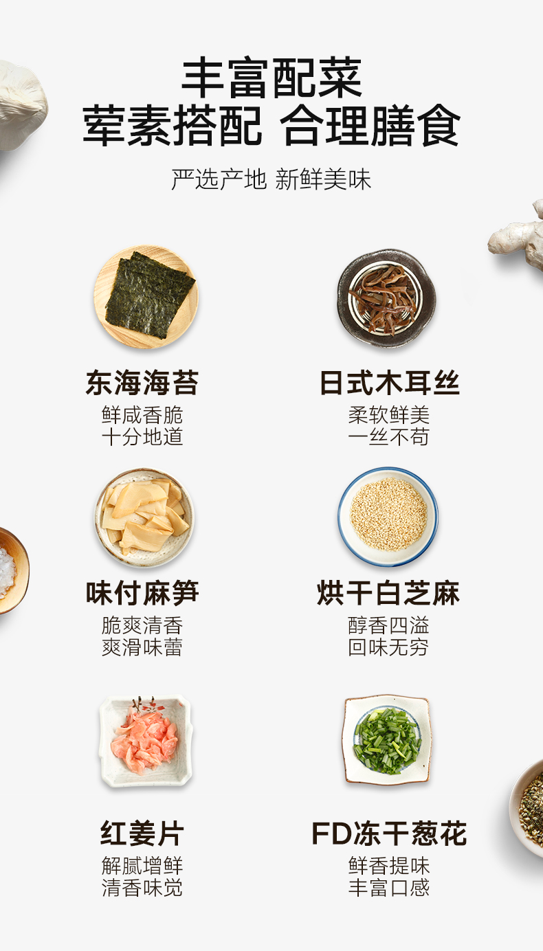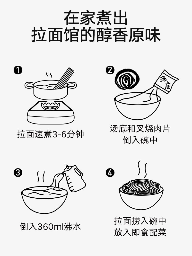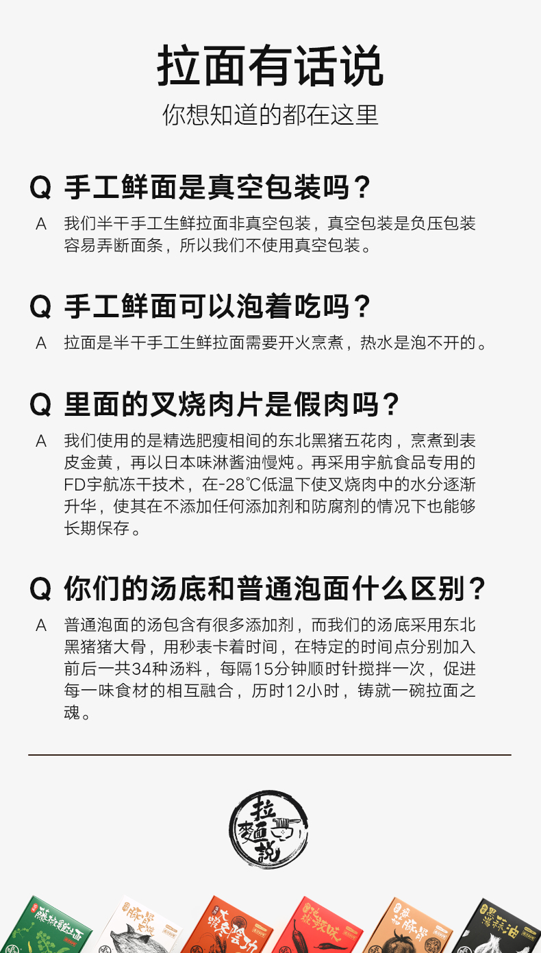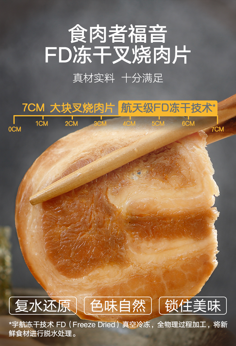 汤底大体决定了拉面的味道,拉面说的汤底通过熬制十几个小时、灌装工艺制得,不添加防腐剂。核心配方从日本企业买断,保证口味独特性。采用半干生鲜面,含水率 20%,保质期 60 天。真的有大块叉烧肉在里面!采用宇航冻干技术保存的大块叉烧肉,既保证肉的口感,也能常温保存。