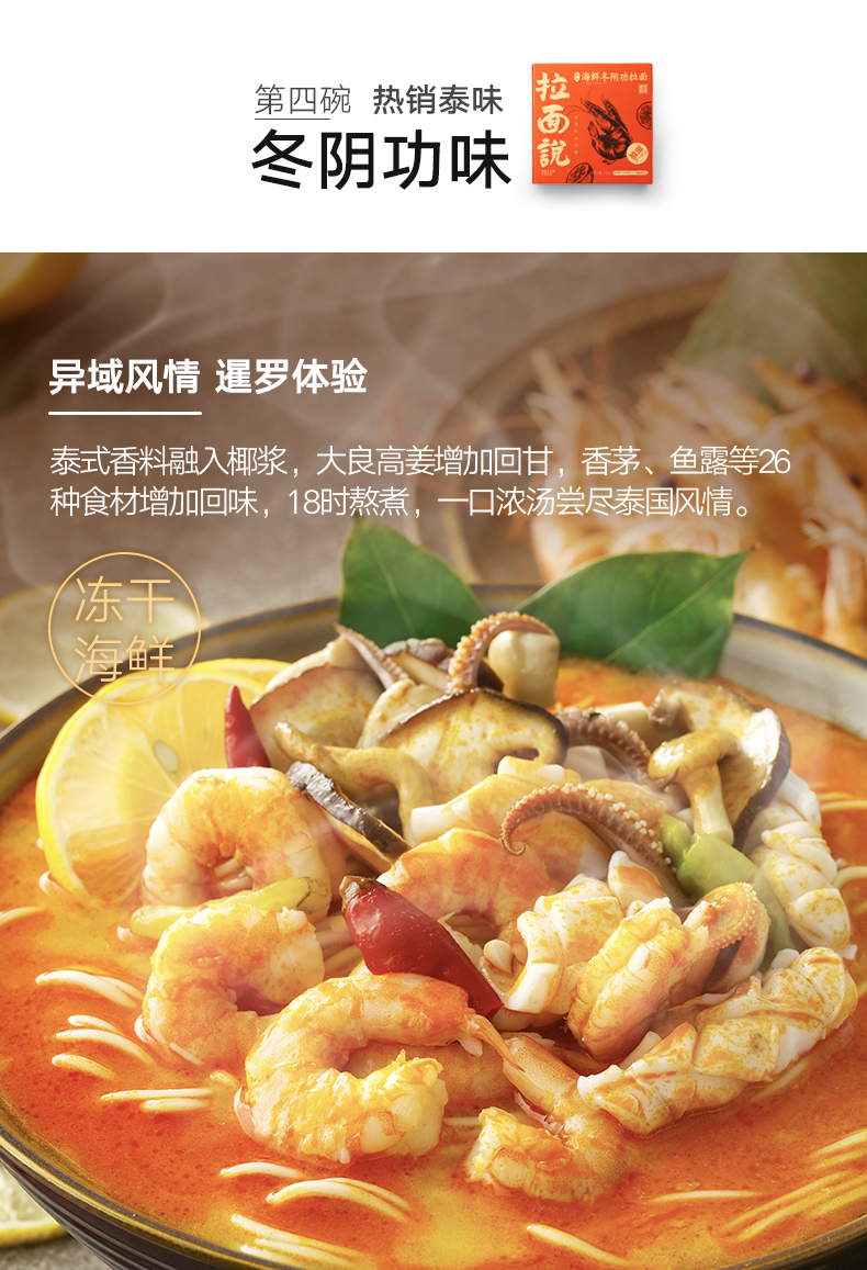 海鲜冬阴功拉面:泰式香料融入椰浆、大良高姜增加回甘,香茅、鱼露等26位食材,正宗泰国风味。