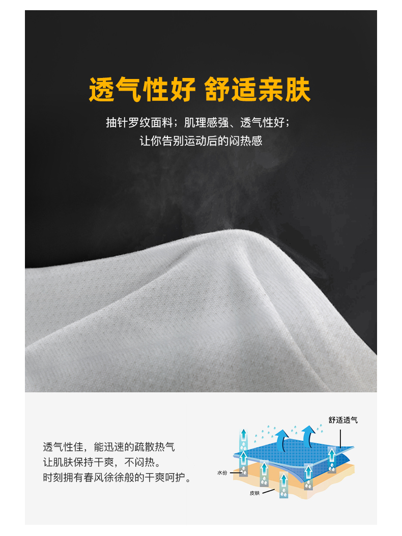使用针织工艺,面料线与线之间有空隙(参考毛衣),这种织物结构自带弹力,再加上面料本身所含的弹力纤维,上身无紧绷束缚感,不影响运动时的灵活性。