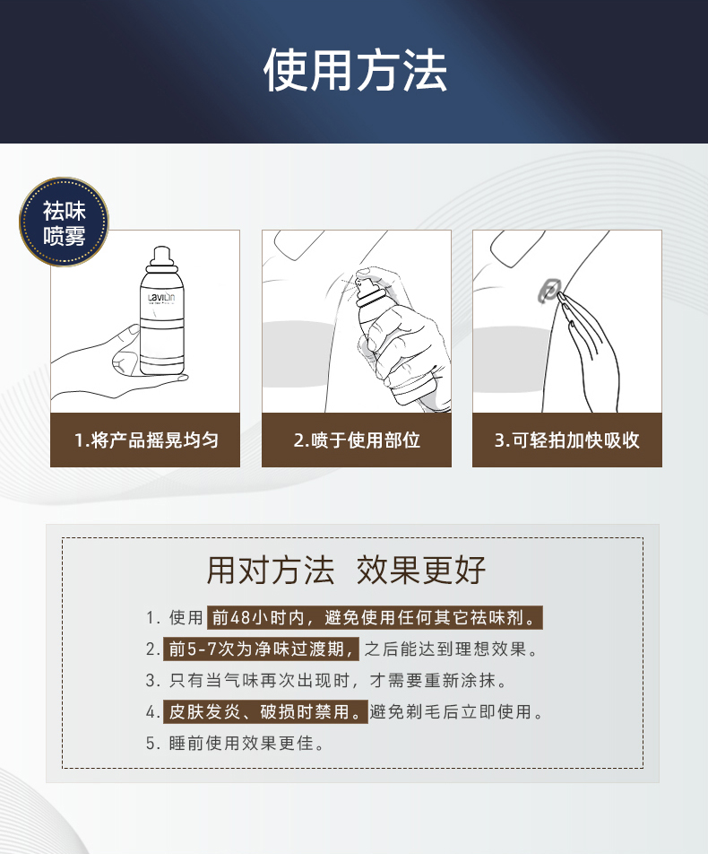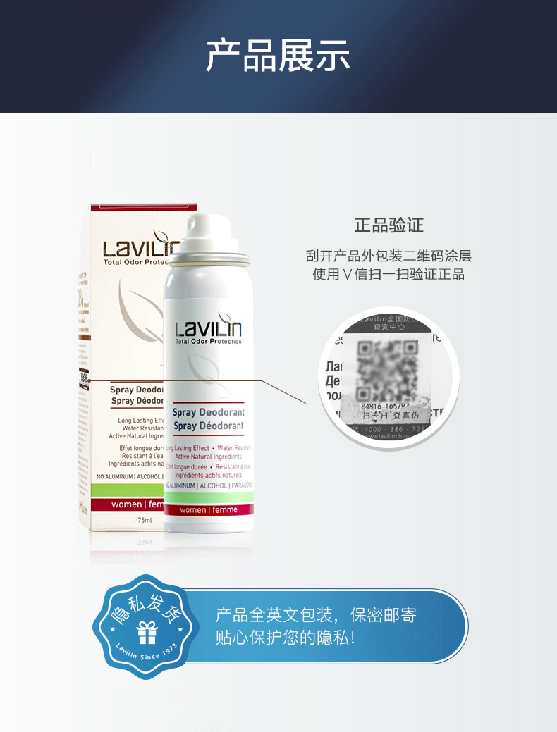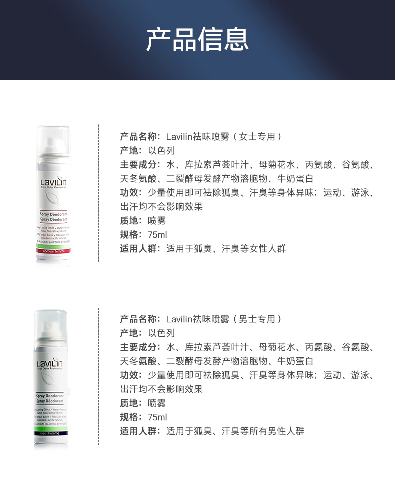 这款Lavilin 祛味喷雾,以色列原装进口,天然植物精粹,特别添加了谷氨酸、天冬氨酸、丙氨酸三种氨基酸养护肌肤成分。秒吸收祛味快,少量使用即可中和细菌活动,温和有效深层祛味,可祛除狐臭、汗臭等身体异味,而且不抑制正常排汗。防水、防汗、可游泳、可洗澡均不会影响效果。