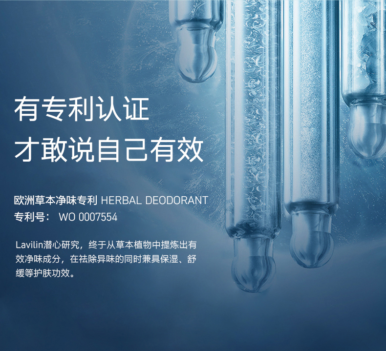 2. 欧洲草本净味技术专利(WO 0007554),Lavilin在祛除异味的同时兼具保湿、舒缓等护肤功效,不含酒精、尼泊金、铝盐等损肤成分。