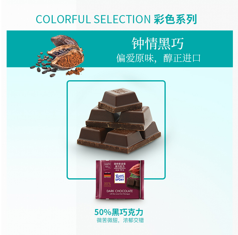 这款巧克力选用进口高品质原料,德国匠心制作,不含代可可脂、不添加防腐剂等化学添加剂,包含18种缤纷口味,13种组合可选。