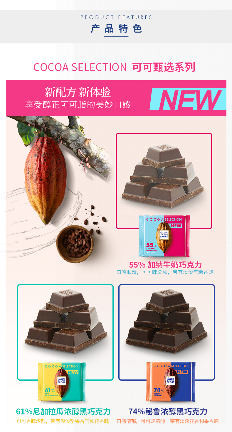 可可甄选系列:55%加纳牛奶巧克力、61%尼加拉瓜浓醇黑巧克力、74%秘鲁浓醇黑巧克力;