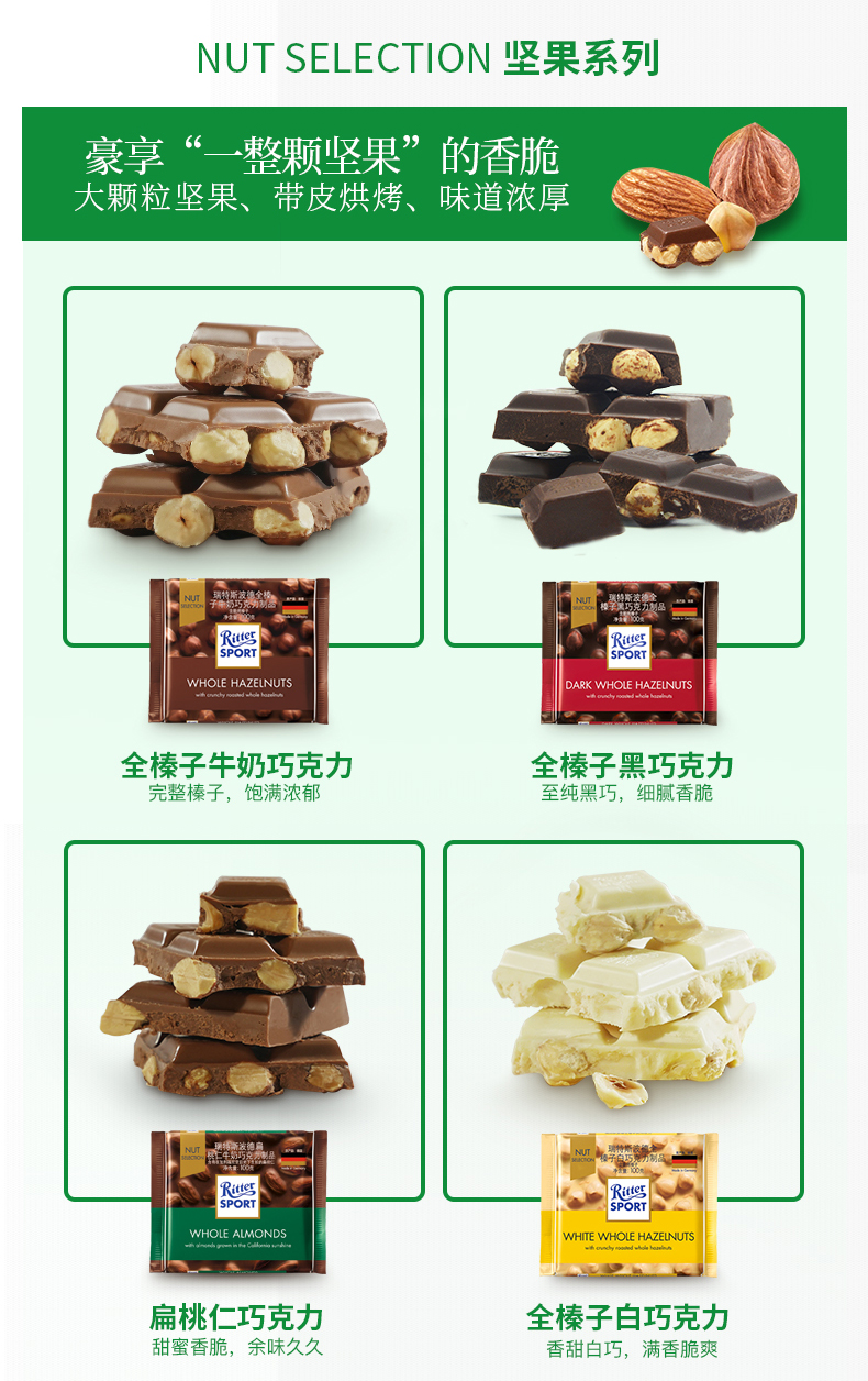 坚果系列:全牛奶榛子巧克力、全榛子黑巧克力、扁桃仁巧克力、全榛子白巧克力;
