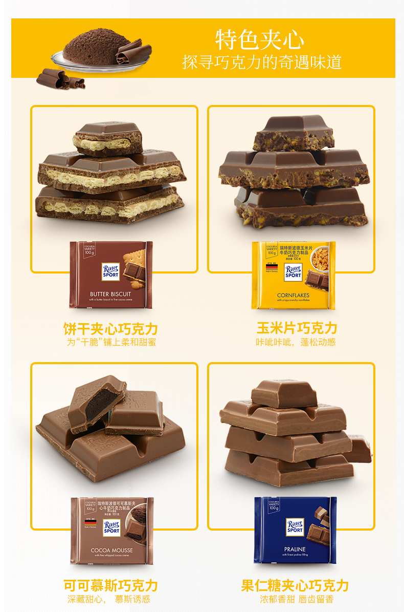 特色夹心:饼干夹心巧克力、玉米片巧克力、可可慕斯巧克力、果仁糖夹心巧克力、