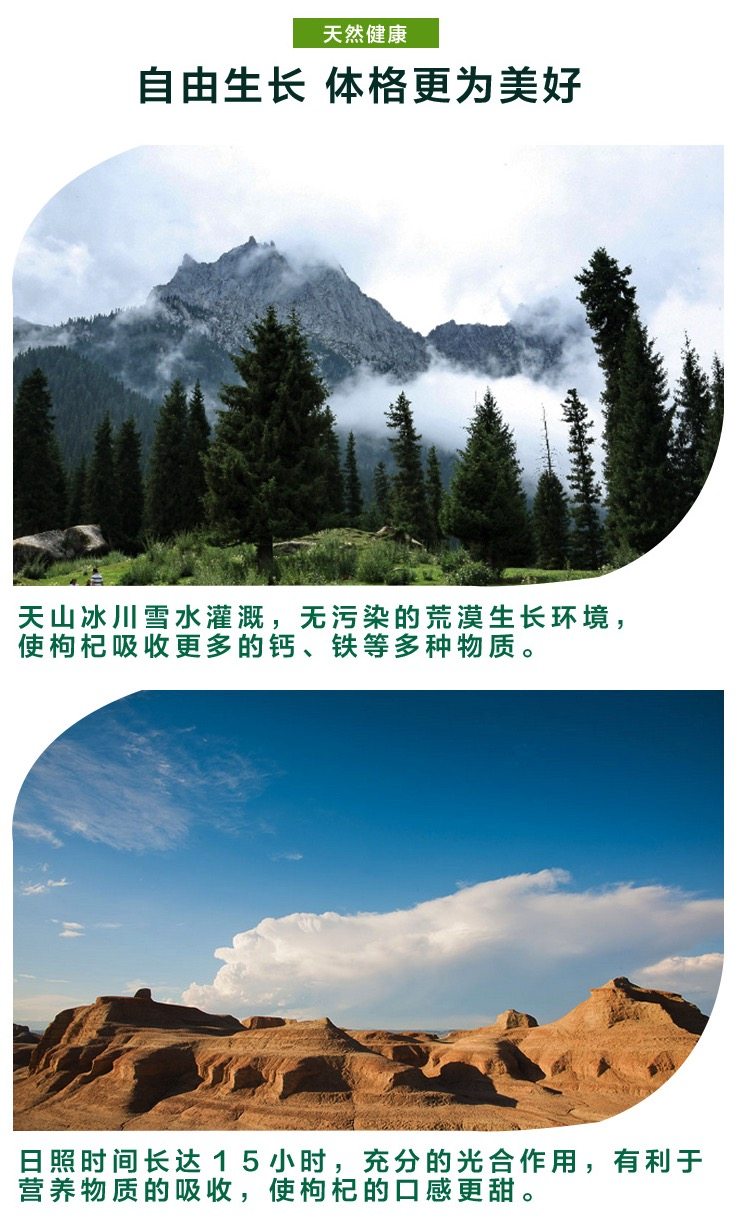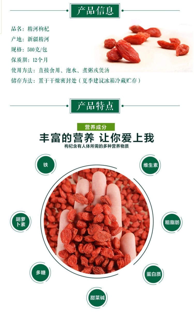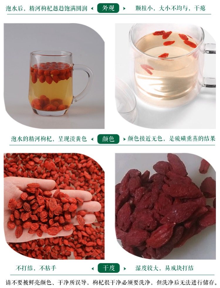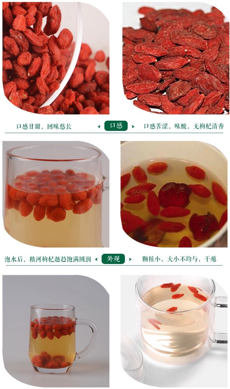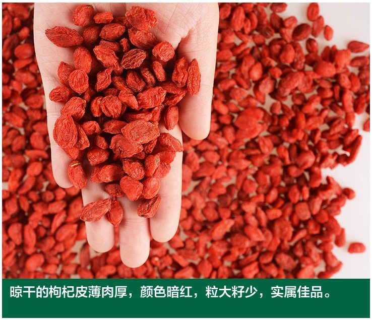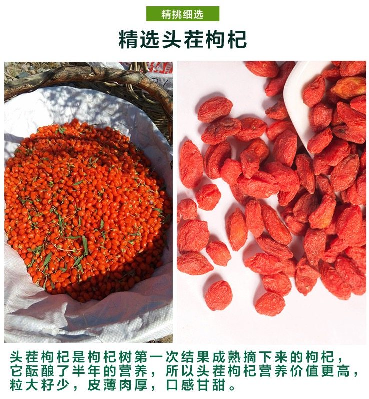 选用头茬枸杞,头茬枸杞是枸杞树第一次结果成熟摘下来的枸杞,它酝酿了半年的营养,所以头茬枸杞的营养价值更高,粒大籽少,皮薄肉厚,口感甘甜;枸杞的大小在150粒/50g左右,属于大颗粒枸杞。