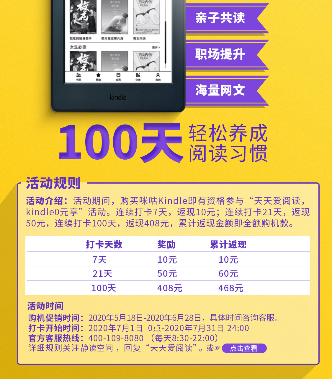 具体的活动规则可以联系客服查看,简单来说就是到手后先激活,然后从7月1号开始,连续每天阅读15分钟以上,期间要保持着机器的联网状态,完成后就会全额现金返现,要是中间断了的话就视为任务失败,我已经入了,一是想薅个羊毛,二是想培养一下自己的阅读习惯。