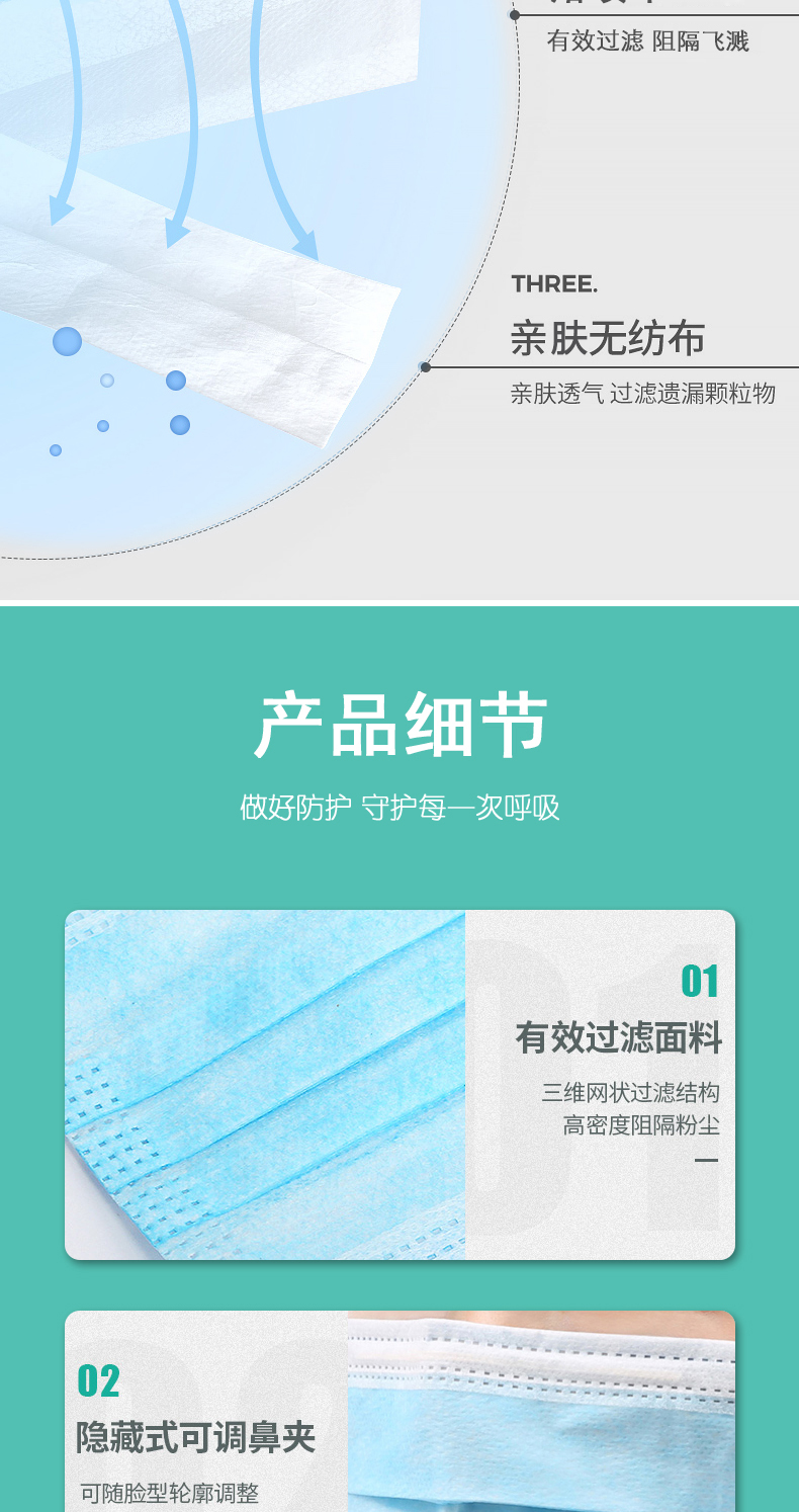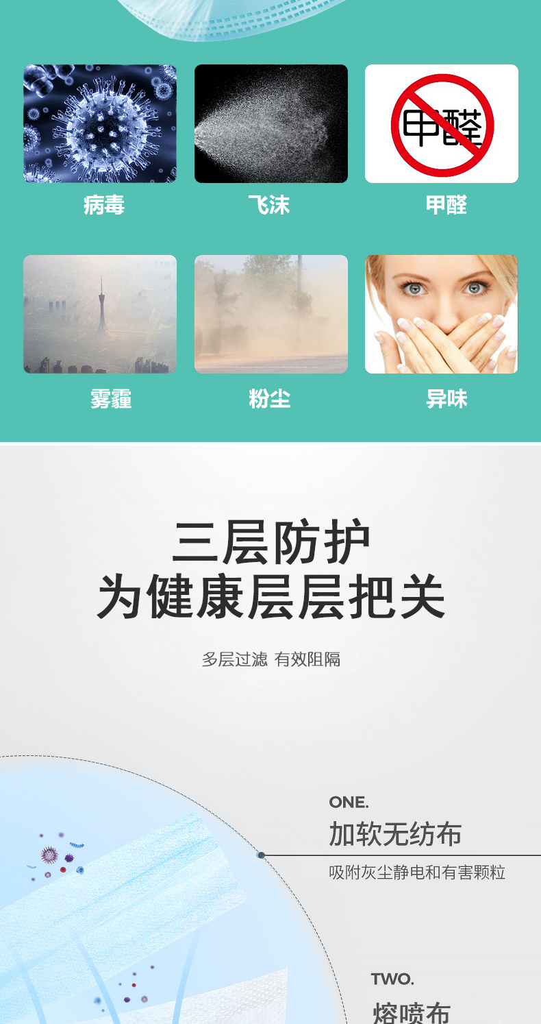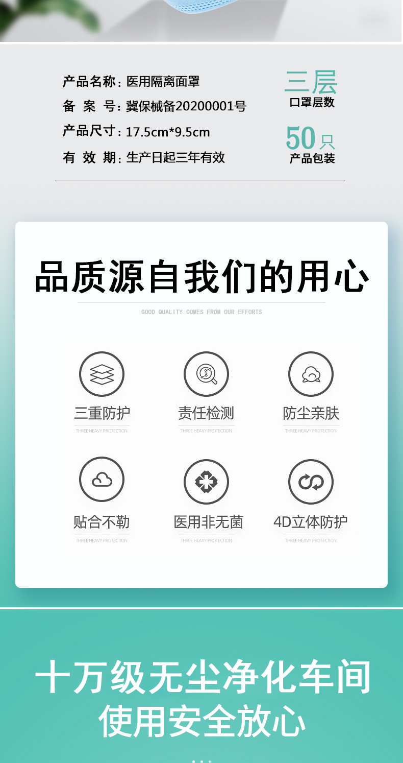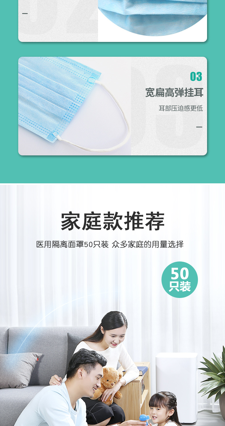 三层加厚设计,中间含熔喷布层,最里为无纺布层,有可塑鼻夹,佩戴舒适。不管是过滤效果还是外层防水性,在标准上都优于民用款,而且具有药监备案,现在口罩逐渐解禁,网上的产品良莠不齐,购买时更要擦亮双眼。