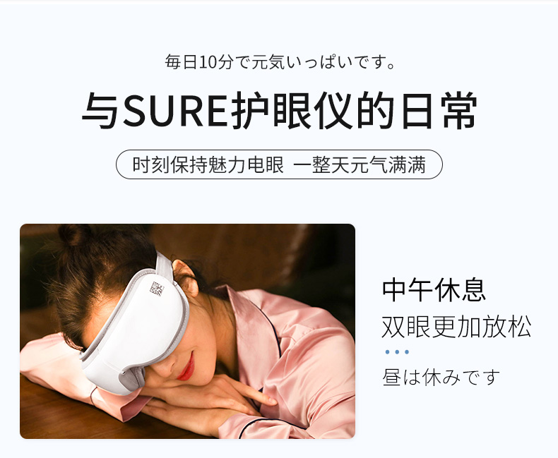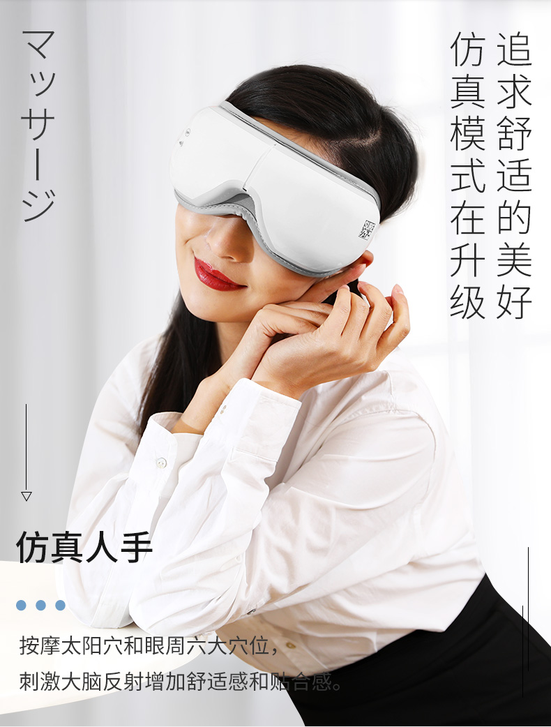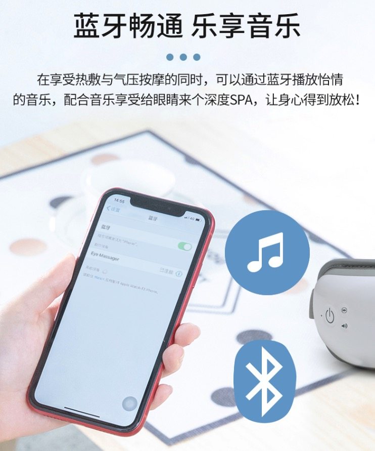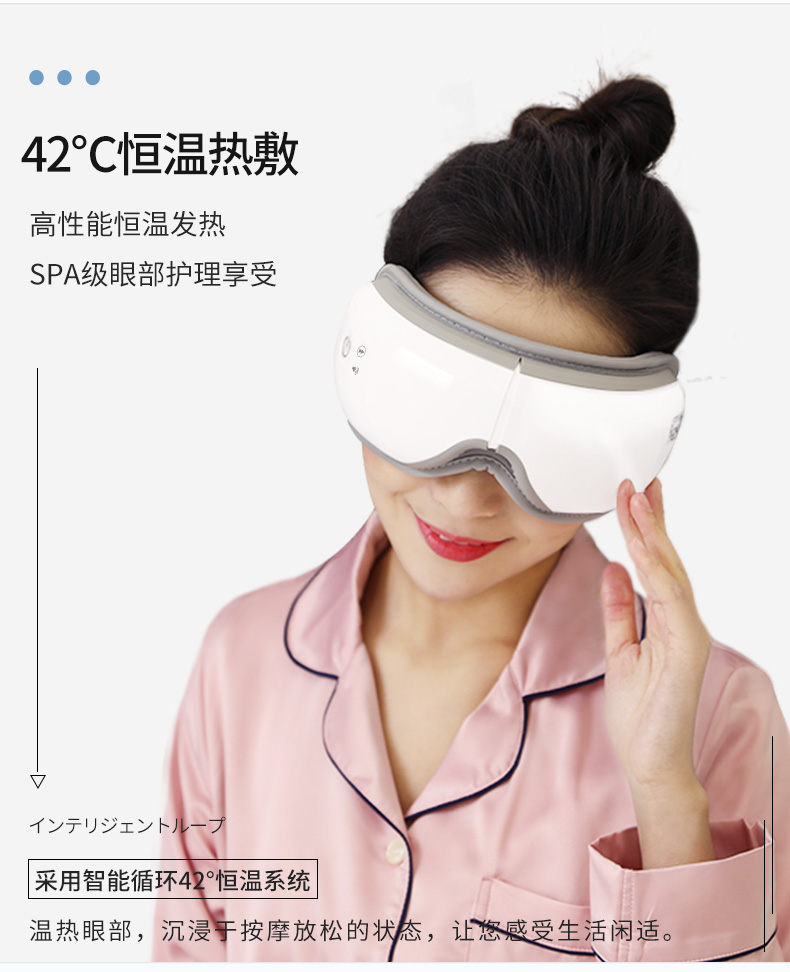 功能上:智能气囊按摩六大穴位,多频震动放松眼部、轻音气泵,噪音低寿命长,配合高频生物磁场促进眼部快速疏解,有效释放眼部压力,有轻柔模式、强力模式、唤醒模式、睡眠模式共四种模式任意切换;42°恒温发热,SPA级眼部护理享受,加速血液循环,辅助按摩,可快速缓解疲劳。