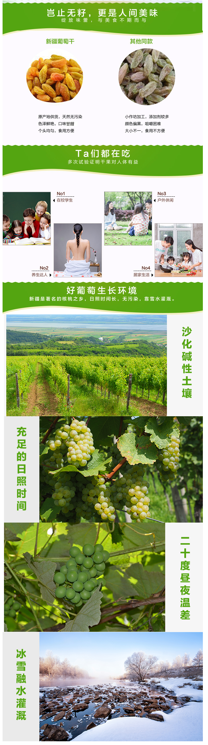葡萄干通体碧绿通透,色如翡翠;颗粒均匀修长,果肉丰厚饱满,更有嚼劲;肉厚无籽,甜度适中,甜中带酸不腻口。
