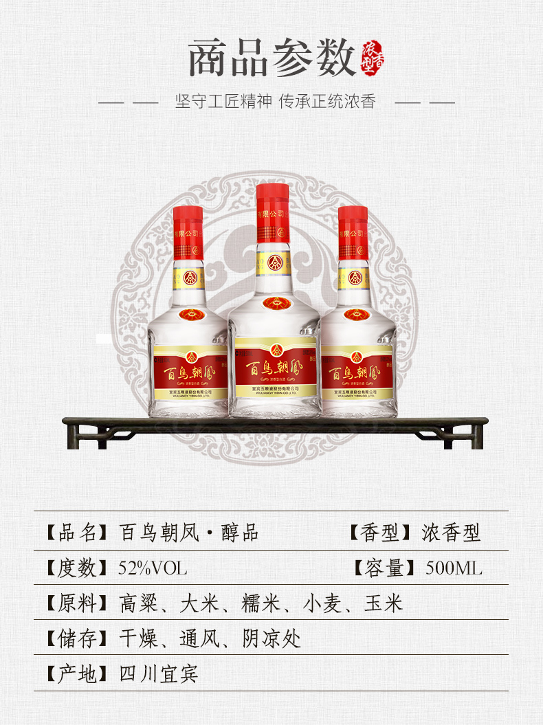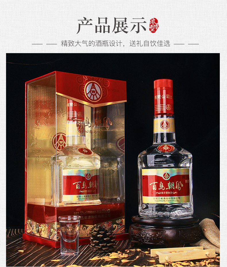 这款五粮液百鸟朝凤醇品,由宜宾五粮液股份有限公司出品,在五粮液总部四川宜宾生产,精选高粱、大米、糯米、小麦和玉米酿造而成,酒香气扑鼻、酒质清澈,酒精度为52%vol,规格:500ml*6瓶。每一瓶单独配有亚克力礼盒包装,并送有手提袋,自用送礼都很上档次。