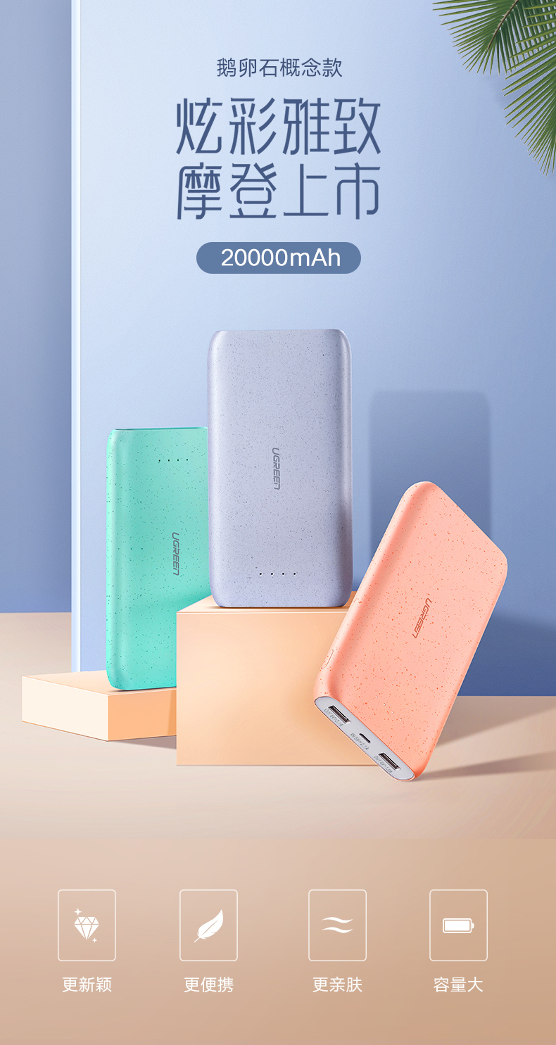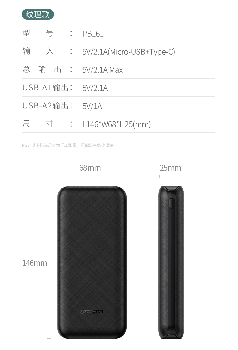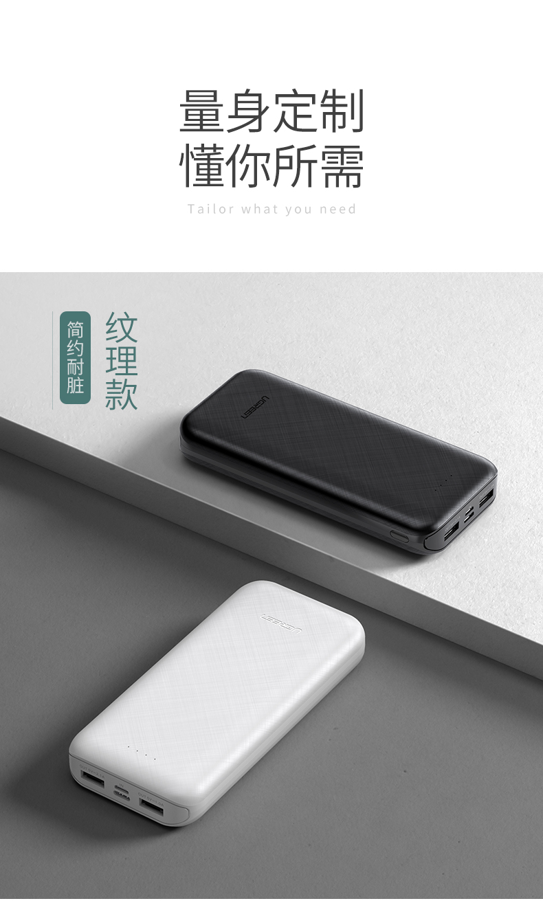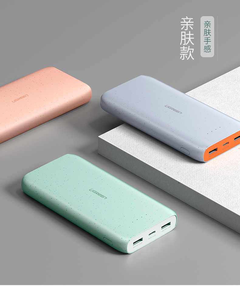 这款绿联便携式充电宝为20000mAh,便携轻巧,外壳为PC+ABS塑料,两边弧形设计,整体为鹅卵石元素点缀,表面有手感漆涂层,颜值高,握持感好。
