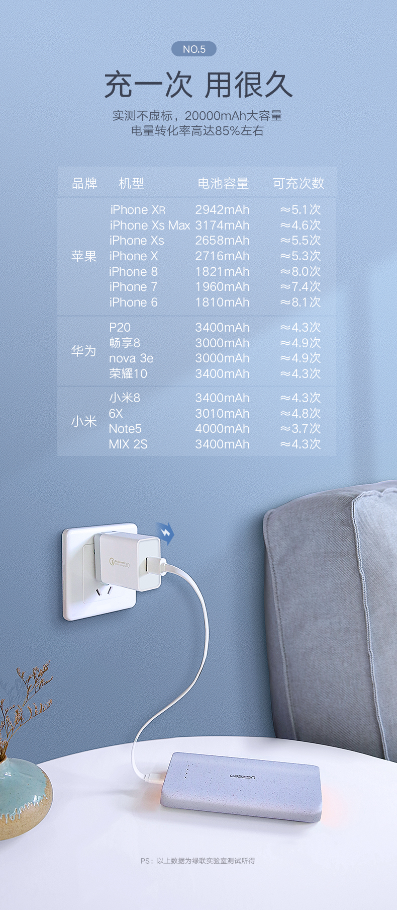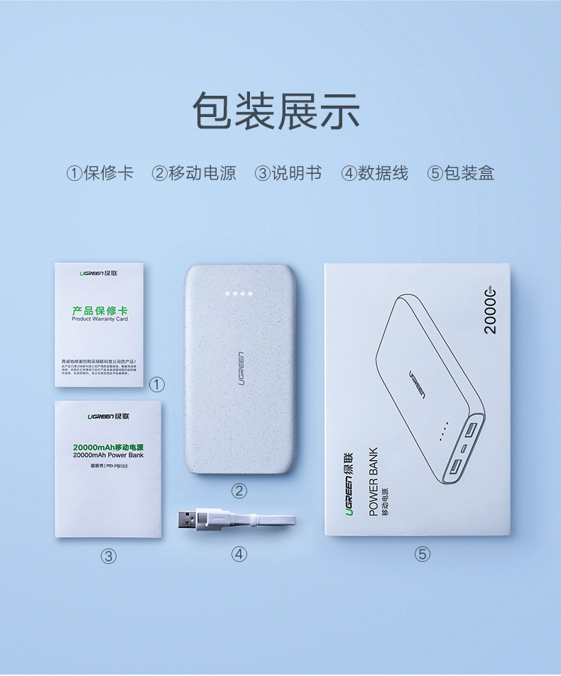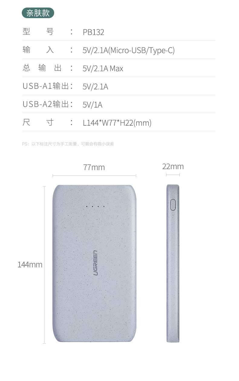 这款绿联便携式充电宝为20000mAh,便携轻巧,外壳为PC+ABS塑料,两边弧形设计,整体为鹅卵石元素点缀,表面有手感漆涂层,颜值高,握持感好。