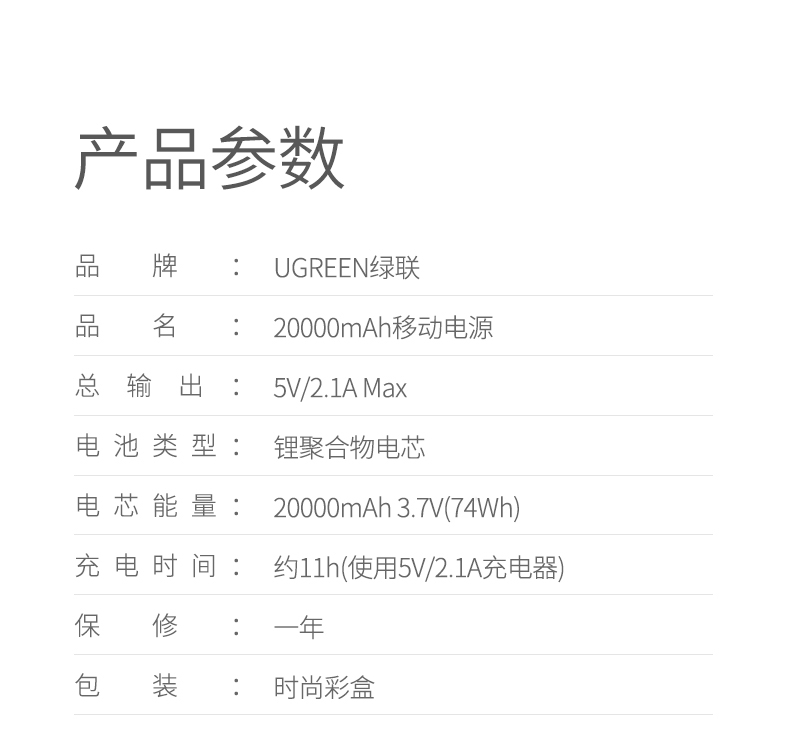 内置温度感应探头,智能感温,快充安全稳定不发烫,双USB输出,最高支持5V/2.1A,采用GPC原厂聚合物锂电芯,通过了UL安全认证,充电安全不漏液,不使用时可长按3秒关机,更省电。