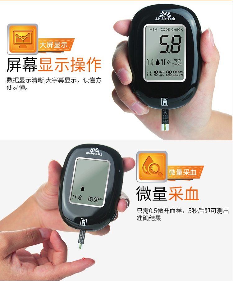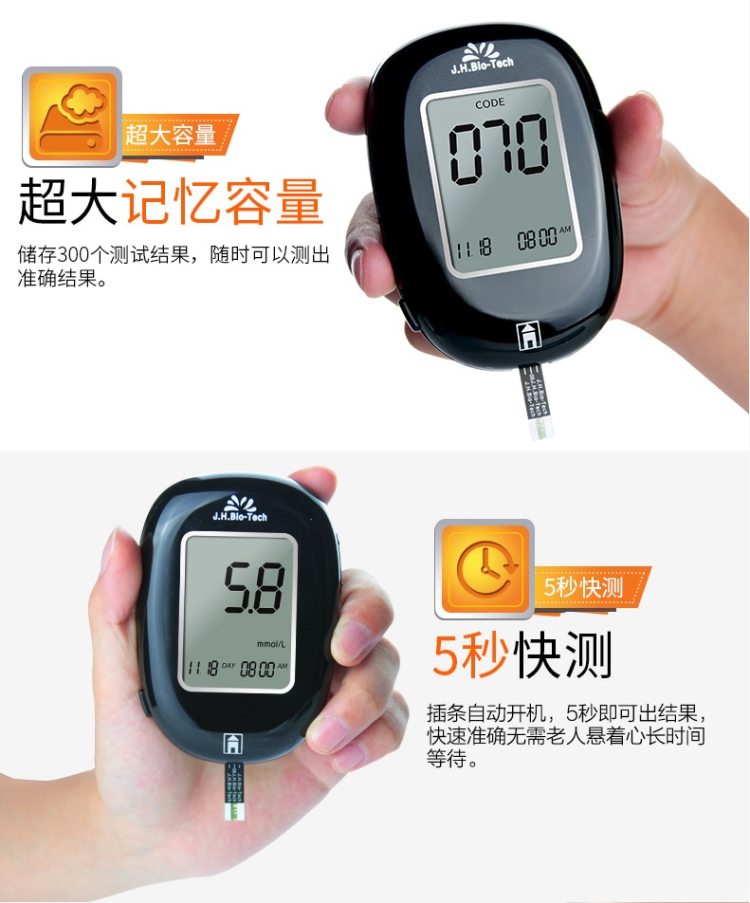 采用新型SOC测量芯片,能快速分析血液样本,急速测量5s出结果,无需等待;插条自动开机,智能免调码,无需手动设置,可明显减少测量误差,一键轻松退条;大屏显示,数值清晰,可以储存300组记忆值方便查阅。