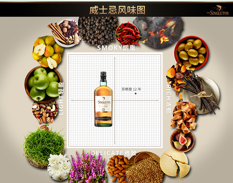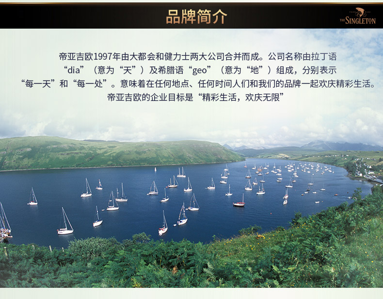 苏格登是帝亚吉欧旗下单一麦芽威士忌之旗舰品牌,用于酿造苏格登的泉水取自位于苏格兰超过1,000尺高的娜英湖与波娜湖,前者源自天上雨水,后者则为地下涌泉,是天与地恩赐而成的“天地之水”。酒厂成立于1838年,距今已有170年的历史。